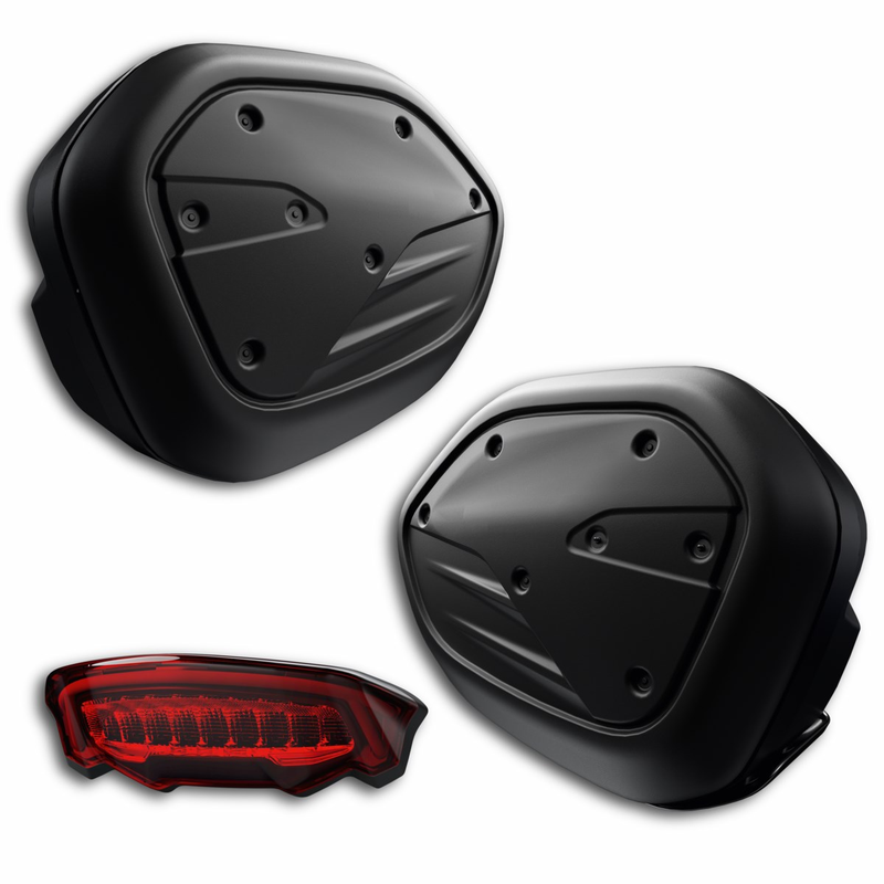Style, large capacity, resilience: these are the strong points of the new semi-rigid side panniers. Their expandable capacity lets you carry everything you need for your trip. A new tail light is supplied and replaces the OEM version to restore the bike's type-approval and ensure visibility and safety. The set also includes waterproof covers, so you will not be caught out in the rain. The design and styling make them a perfect match for the bike's muscular, elegant lines. The perfect accessory for enjoying every adventure to the full.