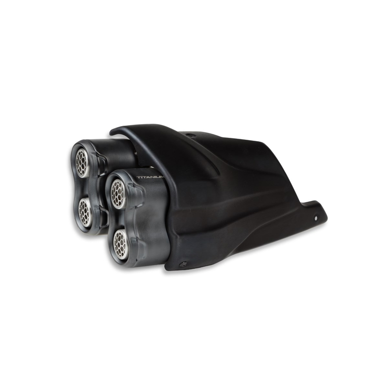 Sportiness, lightness, and strength. These are the characteristics of the silencer cover for homologated exhaust. The titanium endcaps and anodised aluminium heat guard enhance the design of the standard system, making it even more appealing.