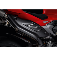 The combination of Akrapovič's engineering expertise and Ducati's passion has produced a full racing exhaust system crafted entirely from titanium. In addition to withstanding high temperatures, the system also meets track noise regulations at a standstill with an exhaust level below 105 dB @5500 rpm, in compliance with the FMI CIV SBK regulations. The special titanium alloy further lightens the bike, significantly improving the power-to-weight ratio for consistently excellent performance on the circuit. It is equipped with a racing-derived polyester air filter that, besides being more permeable, guarantees excellent filtering power and easy maintenance. It also features an innovative canister assembly which recovers the fuel that escapes during aggressive braking and returns it to the tank, contributing to consistent top performance. The map provided, with which all DTC - DWC - DPL and DSC parameters are adapted to the bike new performance, and the careful work carried out on torque and power have led to improvements over the entire range of use of the Panigale V4. Aesthetically, the dual under-seat silencer makes the bike design even more unique, giving it an additional aggressive touch with its unmistakable sound.