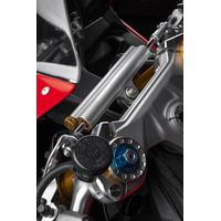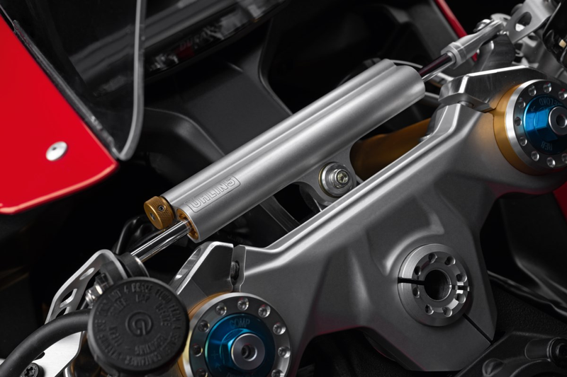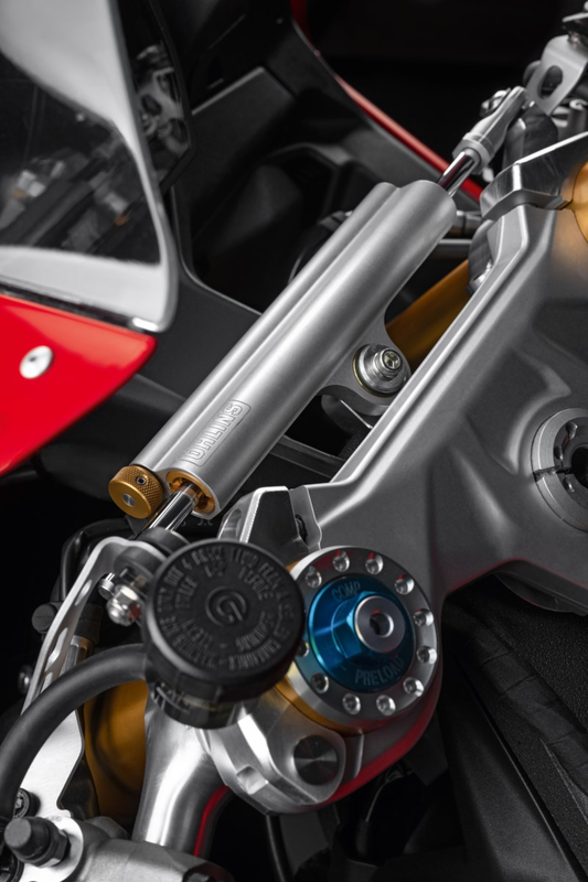 A jewel of racing-derived technology that proves as useful on the track as it is on the road, as it makes it possible to adjust the stiffness of the shock absorber to give even better stability at high speeds and when exiting corners. The finely CNC machined aluminium mounting brackets maintain their original appearance over time thanks to high quality anodising. A styling detail that enhances the aesthetics of the bike, in a perfect combination of performance and design, accentuating the aggressive look of the super sports bike.