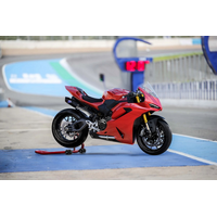 Designed and manufactured to reduce lap times on the track. The Termignoni racing exhaust increases power to 126 hp and reduces weight by 4.5 kg. The right fairing is required to be able to install the racing exhaust. Adjustable footpegs, carbon heel guards and low handlebars offer sportier ergonomics, while the steering damper improves front-end stability. Carbon protectors for the clutch and generator housings, together with mirror hole covers and the number plate holder removal cover, lend a racing finish. This accessories package is the basis for transforming the Panigale V2 into a track-ready bike, providing the rider with a set of Ducati Performance accessories designed for maximum performance on the track.