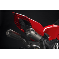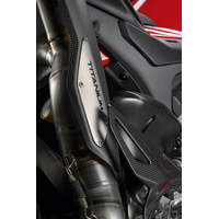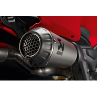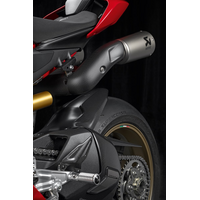 Akrapovič's manufacturing expertise has resulted in the most advanced complete racing assembly available on the market. This accessory complies with the noise limit required on track at a standstill with an exhaust sound level of less than 105 dB @5500 rpm, according to the FMI CIV SBK regulations. Developed by Ducati Corse engineers and intended for use in races and circuits requiring such compliance. However, compliance with the noise limit does not compromise performance, thanks to the careful work done on torque and power, which has allowed improvements to be made across the entire range of use, thus making the bike race-ready. Each part of this system is made from a special titanium alloy ensuring not only considerably lower weight but also great resistance to the high temperatures that can be reached. The exhaust system significantly improves the already high weight/power ratio of the Panigale V4 bike. Equipped with a racing-derived polyester air filter that, besides being more permeable, guarantees excellent filtering power and easy maintenance. Top performance not just thanks to the racing materials but also the map supplied, which adapts all the parameters of DTC - DWC - DPL and DSC to the bike's new performance. The double under-seat silencer makes the design of the bike even more unique and enhances the unmistakable look of the Panigale V4 with an additional bold touch. A true race-replica also for the typical sound.
