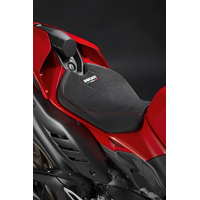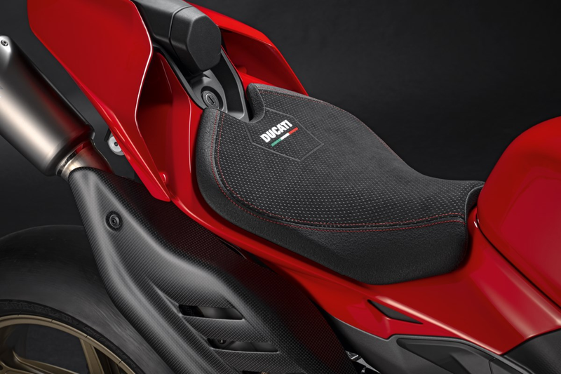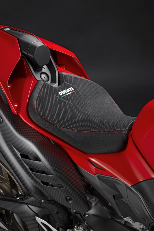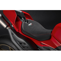 A high-performance racing seat crafted from premium materials to ensure perfect grip and comfort. The central section features perforated ultrasuede for added comfort, while the sides feature a more textured material for enhanced grip. This design increases the friction between the rider's suit and the seat, enabling a secure and effortless riding position, even during aggressive leaning.