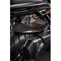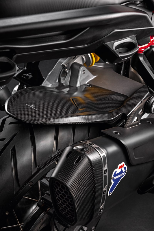 An accessory with clean but striking design that perfectly matches the bike's line. Lightweight and strong, it is enhanced by the unmistakable finish of carbon fibre, which lends an additional detail of aggression to the rear end.