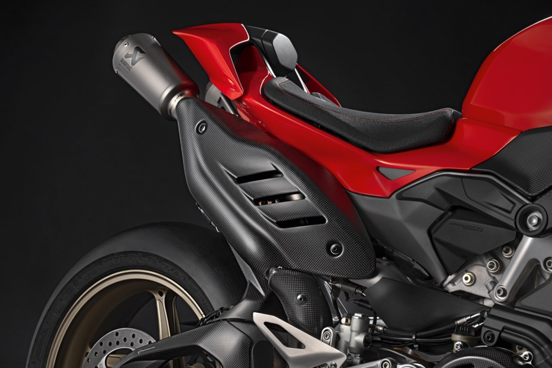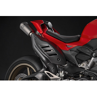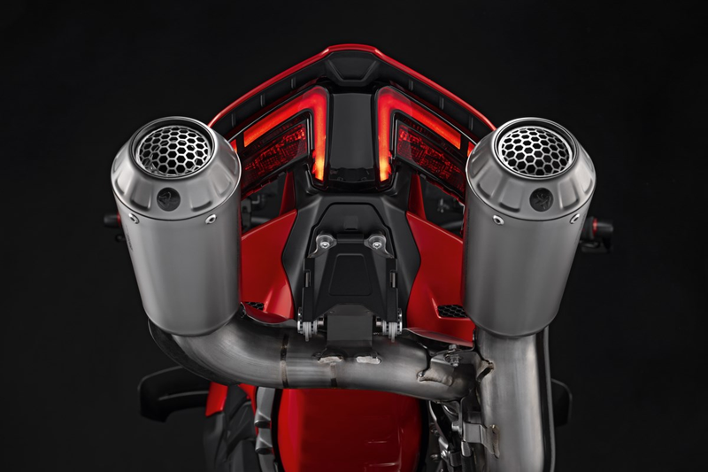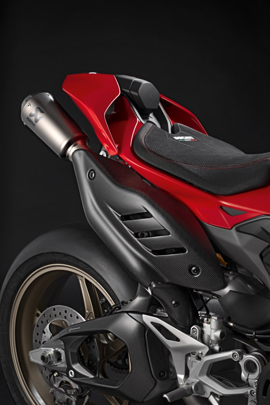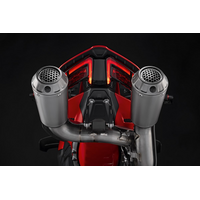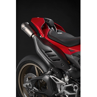 Akrapovic's manufacturing expertise and the passion of the Ducati technicians are brought together in this complete racing exhaust system made entirely of titanium. This system can withstand high temperatures and complies with the noise limit required on track at a standstill with an exhaust sound level of less than 105 dB @5500 rpm, according to the FMI CIV SBK regulations. It's made of a special titanium alloy, which further lightens the bike, improving the power-to-weight ratio for consistently excellent performance. It features a racing-derived polyester air filter, which, besides being more permeable, also guarantees excellent filtering power and easy maintenance. The map provided as standard adapts all the DTC - DWC - DPL and DSC control parameters to the bike's new performance levels, and the careful torque and power work have led to improvements across the Streetfighter V4's entire range of use. Aesthetically, the dual under-seat silencer makes the bike design even more unique, giving it an additional aggressive touch, which is completed by its unmistakable sound.