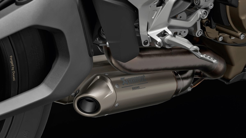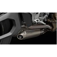 Ducati's original design blends with Akrapovič's constructive attention to detail with these slip-on racing silencers, achieving excellent results. Investments in the dedicated engine map and specific maps of the DTC, DPL and DWC ensure maximum performance by responding to specific track requirements. Made entirely of titanium, the system on the Streetfighter V4 not only ensures a considerable reduction in weight compared to the standard model, but also significantly changes the bike's torque and power delivery, giving it true world-class performance.