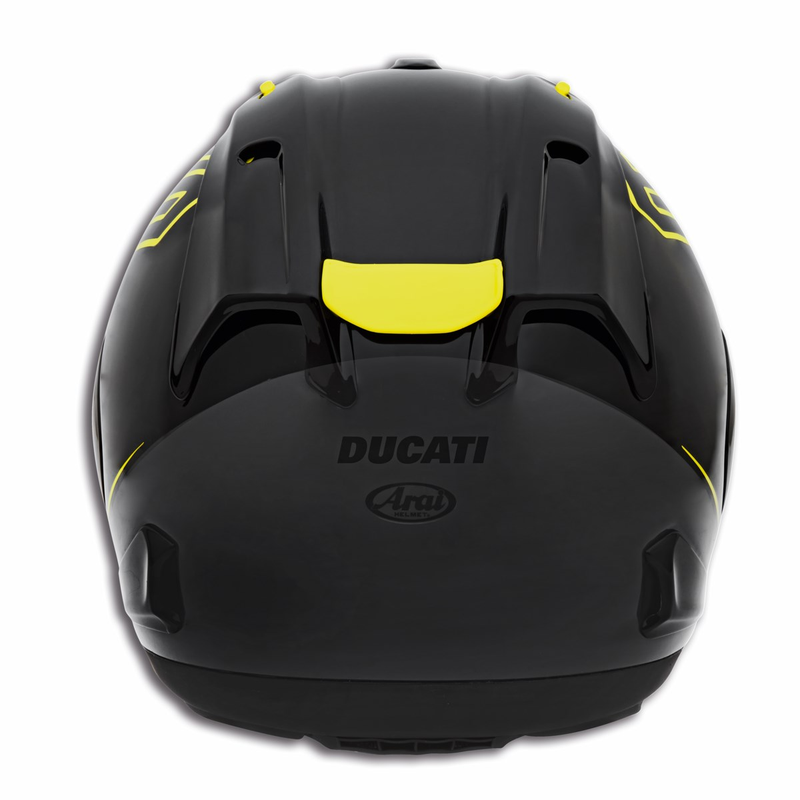 Experience the thrill of the track with this top-of-the-range Panigale V4 Lamborghini racing helmet. Specially manufactured by Arai for sports enthusiasts and designed by the Ducati Design Center, this exclusive full-face helmet is dedicated to all Panigale V4 Lamborghini owners and represents the perfect match between modern style and performance. The key feature of the helmet is its level of safety, guaranteed by the composite fiber outer shell which protects against knocks and dissipates energy in the event of impact. The visor is scratch-proof, anti-fog, and certified to all current directives and regulations; it offers the rider comfort and safety thanks to the VAS technology, which envisages perfect peripheral vision. The optimized aerodynamics of the diffuser enhance stability and efficiency at high speeds, while the new sliding ventilation closure reduces aerodynamic noise, revealing the racing character of the helmet. The exceptional fit provided by the elastic FCS foam support, which reaches as far as the cheekbone, reduces pressure and promotes ventilation and stability, joining forces to provide exceptional performance and a perfect fit. The inner liner is made of fine Eco-Pure® hypoallergenic fabric, and the neck padding is removable and washable. The helmet also boasts superior comfort from a thermal point of view, thanks to the air intakes and the aerodynamically shaped, more efficient side extractor. A helmet with an aggressive mood and original colors and lines, rendered unique and iconic by the application of the Automobili Lamborghini logo: ideal when taking to the track to make your mark.