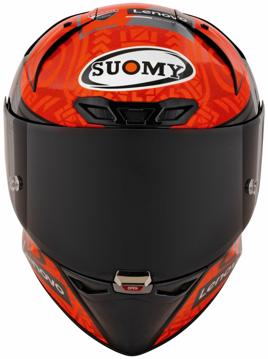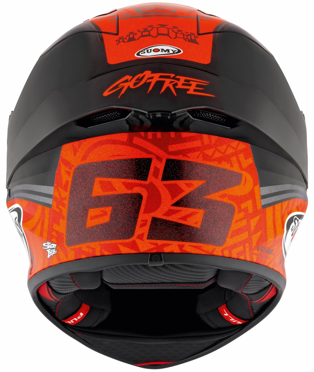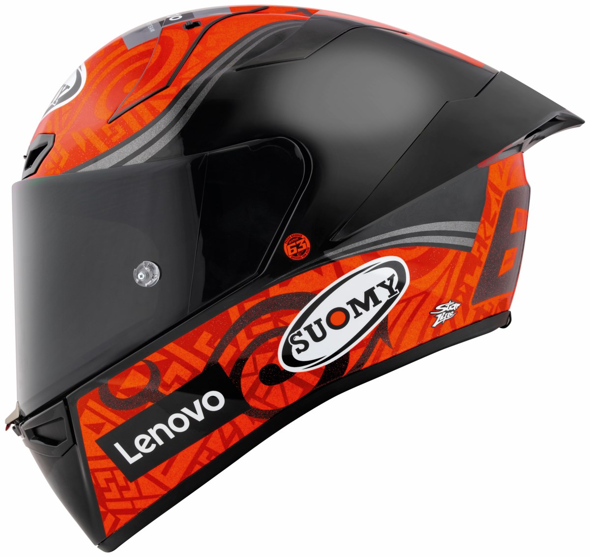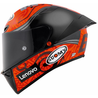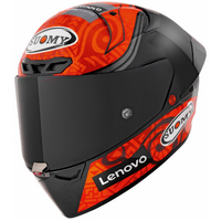 Step into the shoes of the famous racer Pecco Bagnaia with the racing inspired Replica Bagnaia helmet for sports use. The predominant Ducati red on the front and the graphics dedicated to the champion bestow a bold, adrenaline-driven look; those who wear it know what they want and know how to achieve it. The shell is made of TRICARBOCO, a mixture of carbon fiber, with various weights and breaking loads, and aramid composite material, which makes it possible to produce a shell that is lightweight yet impact resistant. The inner shell is made of a differentiated density polystyrene, designed to allow a gradual and progressive absorption of the impact force generated by a collision. The inner liner is made of anti-bacterial treated polyester fabric and has removable, washable and replaceable inner elements and cheek pads. The PINLOCK Max Vision 120 injection polycarbonate visor is in optical class 1 and equipped with a "Racing Lock System" which reduces the possibility of it detaching in the event of a fall. To complete the equipment, there is a D-ring strap closure and front and side air vents which, together with the ventilation system allow for efficient air flow exchange and promote well-being and lucid riding. A high-performance, aerodynamic racing helmet that will allow you to enjoy the thrill of a MotoGP, ensuring safety and comfort during every lap of the track.