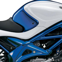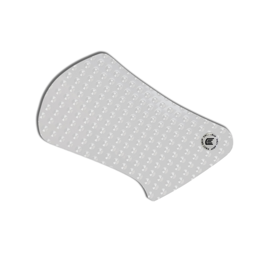 Eazi-Grip EVO - the non-abrasive high traction tank grips Suzuki Gladius SFV650 EVO Tank Grips includes Tank Grips, left and right side, clear IPA cleaner Fitting Instructions Manufactured in the UK from high quality polyurethane, these traction pads are designed to be applied to the fuel tank recesses next to the riders knees and come pre-cut to size. High quality polyurethane with soft but durable domed surface Improves rider control in corners and under braking with minimal effort Non-abrasive - kind to riders clothing and leathers Cut to size - quick and easy to apply - instructions and IPA surface cleaner provided Application Peel back part of the release liner then press the tank grip firmly onto the tank and slowly peel back the liner whilst applying the grip. Push down the surface and take care not to trap air bubbles as you go. Allow 48 hours for the adhesive to fully bond before using the grips. Use an IPA cleaner to prepare surface area NO methylated spirits/petrol/lighter fluid etc. as these leave behind a thin, greasy residue. For best results ensure prepared surface is above 10oC. Also available - Eazi-Grip PRO Tank Grips Race developed in BSB and Isle of Man TT for the more aggressive race or track-day rider, Eazi-Grip PRO Tank Grips features a unique, circular embossed pattern, with a flatter, lower profile that combines excellent grip and durability with exceptional rider feel. Eazi-Grip PRO Tank Grips have been specifically designed to allow greater movement on the bike whilst giving high levels of grip when needed through corners and under heavy braking. Designed, developed and manufactured in the U.K. Hint: Black grips look better than clear on a black tank, where clear grips can appear a little blue. Black grips can also look better than clear on a pure white tank, where clear grips can appear a little yellow. Clear grips are optimised for colours other than black and pure white. NB. Clear grips are supplied with a pink-coloured adhesive liner which makes the grips appear pink until the liner is removed. Suitable for Suzuki Gladius SFV650 2010 - 2016 models only Part No. EVO724CL
