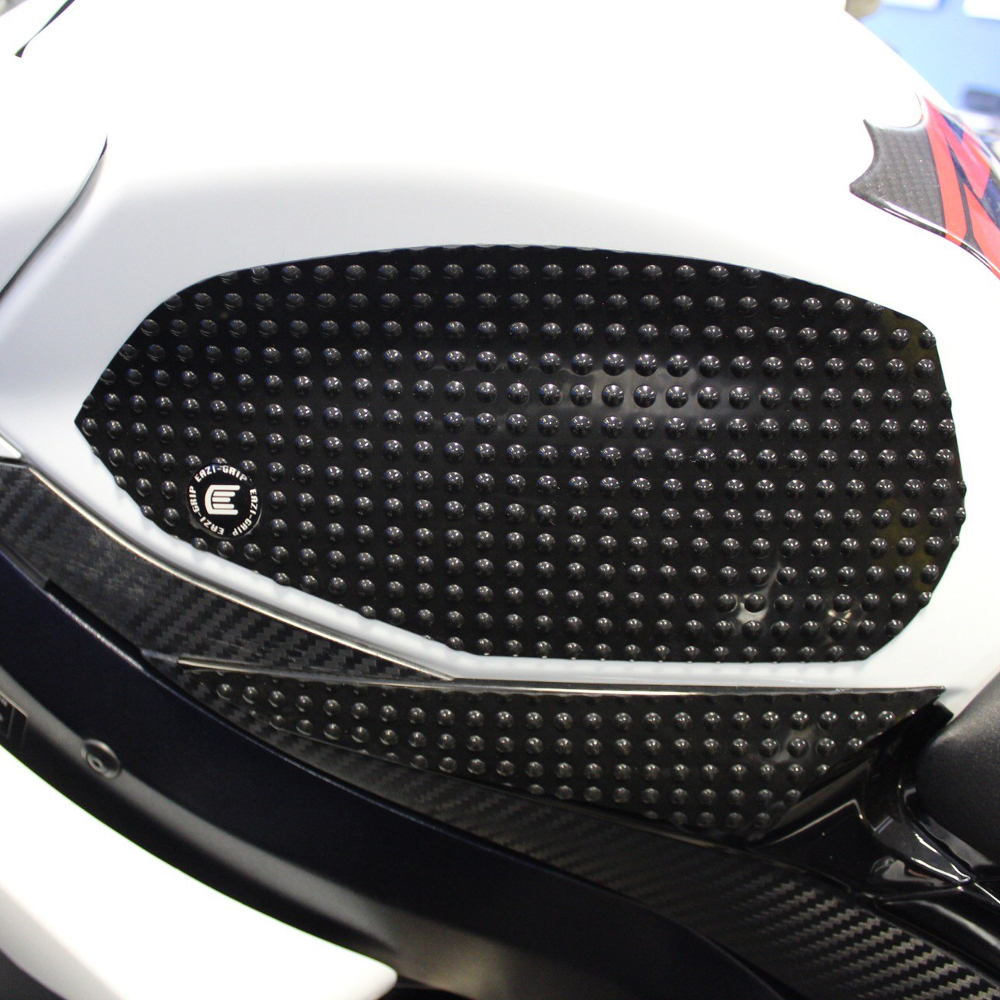 Eazi-Grip EVO - the non-abrasive high traction tank grips Suzuki GSX-R600 and GSX-R750 EVO Tank Grips includes Tank Grips, left and right side, black IPA cleaner Fitting Instructions Manufactured in the UK from high quality polyurethane, these traction pads are designed to be applied to the fuel tank recesses next to the riders knees and come pre-cut to size. High quality polyurethane with soft but durable domed surface Improves rider control in corners and under braking with minimal effort Non-abrasive - kind to riders clothing and leathers Cut to size - quick and easy to apply - instructions and IPA surface cleaner provided Application Peel back part of the release liner then press the tank grip firmly onto the tank and slowly peel back the liner whilst applying the grip. Push down the surface and take care not to trap air bubbles as you go. Allow 48 hours for the adhesive to fully bond before using the grips. Use an IPA cleaner to prepare surface area NO methylated spirits/petrol/lighter fluid etc. as these leave behind a thin, greasy residue. For best results ensure prepared surface is above 10oC. Also available - Eazi-Grip PRO Tank Grips Race developed in BSB and Isle of Man TT for the more aggressive race or track-day rider, Eazi-Grip PRO Tank Grips features a unique, circular embossed pattern, with a flatter, lower profile that combines excellent grip and durability with exceptional rider feel. Eazi-Grip PRO Tank Grips have been specifically designed to allow greater movement on the bike whilst giving high levels of grip when needed through corners and under heavy braking. Designed, developed and manufactured in the U.K. Hint: Black grips look better than clear on a black tank, where clear grips can appear a little blue. Black grips can also look better than clear on a pure white tank, where clear grips can appear a little yellow. Clear grips are optimised for colours other than black and pure white. Suitable for Suzuki GSX-R600 and GSX-R750 2008 K8 - 2010 L0 models only Part No. EVO704BL