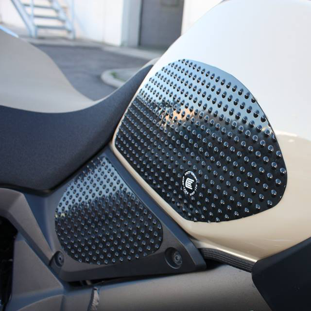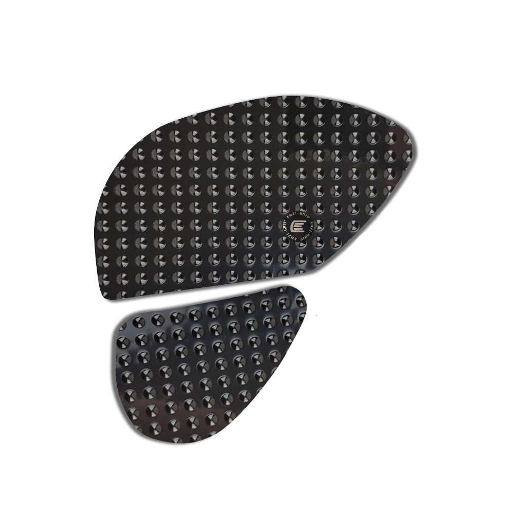 Eazi-Grip EVO - the non-abrasive high traction tank grips Suzuki V-Strom 1000 DL1000 EVO Tank Grips includes Tank Grips, left and right side, black IPA cleaner Fitting Instructions Manufactured in the UK from high quality polyurethane, these traction pads are designed to be applied to the fuel tank recesses next to the riders knees and come pre-cut to size. High quality polyurethane with soft but durable domed surface Improves rider control in corners and under braking with minimal effort Non-abrasive - kind to riders clothing and leathers Cut to size - quick and easy to apply - instructions and IPA surface cleaner provided Application Peel back part of the release liner then press the tank grip firmly onto the tank and slowly peel back the liner whilst applying the grip. Push down the surface and take care not to trap air bubbles as you go. Allow 48 hours for the adhesive to fully bond before using the grips. Use an IPA cleaner to prepare surface area NO methylated spirits/petrol/lighter fluid etc. as these leave behind a thin, greasy residue. For best results ensure prepared surface is above 10oC. Also available - Eazi-Grip PRO Tank Grips Race developed in BSB and Isle of Man TT for the more aggressive race or track-day rider, Eazi-Grip PRO Tank Grips features a unique, circular embossed pattern, with a flatter, lower profile that combines excellent grip and durability with exceptional rider feel. Eazi-Grip PRO Tank Grips have been specifically designed to allow greater movement on the bike whilst giving high levels of grip when needed through corners and under heavy braking. Designed, developed and manufactured in the U.K. Hint: Black grips look better than clear on a black tank, where clear grips can appear a little blue. Black grips can also look better than clear on a pure white tank, where clear grips can appear a little yellow. Clear grips are optimised for colours other than black and pure white. Suitable for Suzuki V-Strom 1000 DL1000 2014 - 2019 models only Part No. EVO722BL