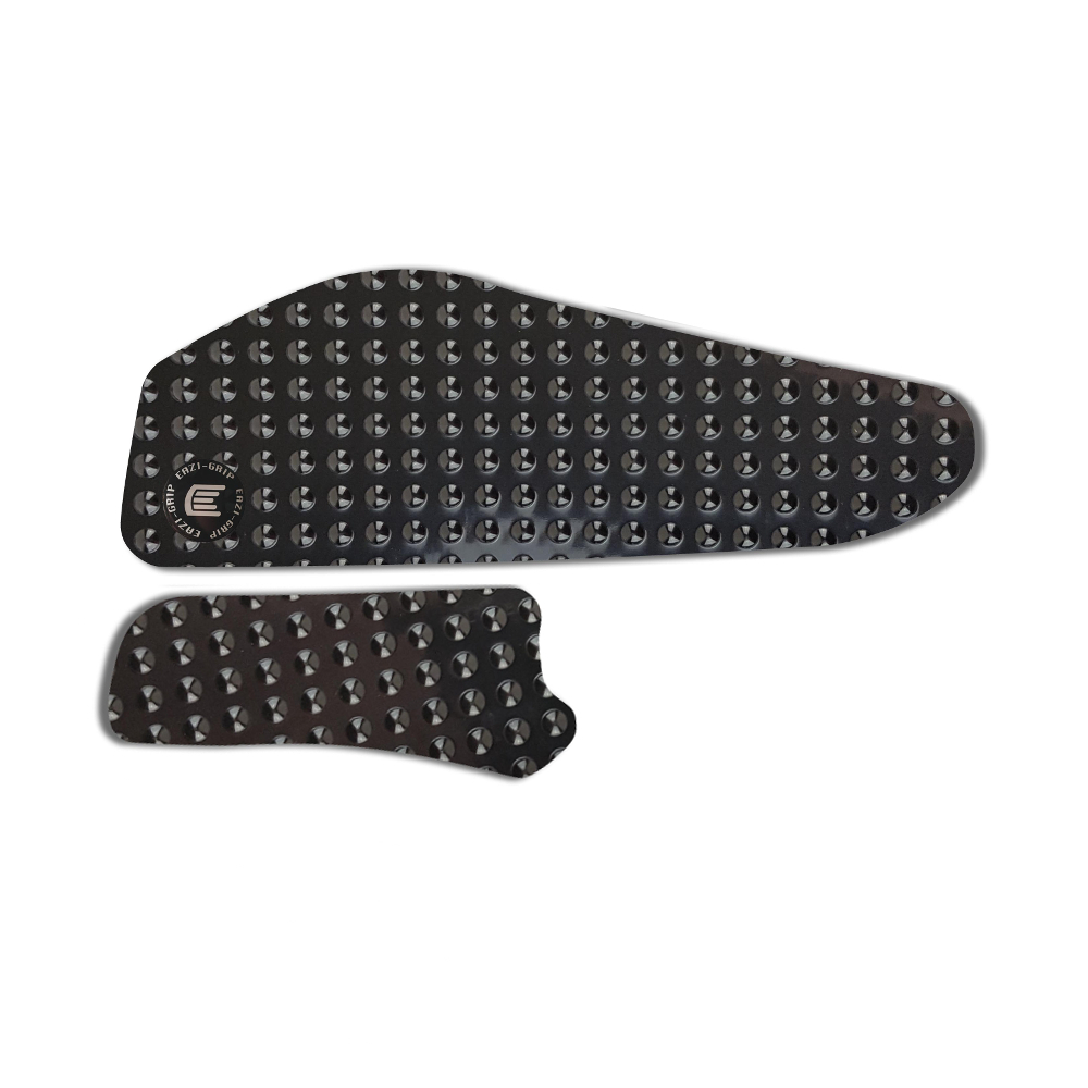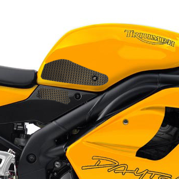 Eazi-Grip EVO - the non-abrasive high traction tank grips Triumph Daytona 955i EVO Tank Grips includes Tank Grips, left and right side, black IPA cleaner Fitting Instructions Manufactured in the UK from high quality polyurethane, these traction pads are designed to be applied to the fuel tank recesses next to the riders knees and come pre-cut to size. High quality polyurethane with soft but durable domed surface Improves rider control in corners and under braking with minimal effort Non-abrasive - kind to riders clothing and leathers Cut to size - quick and easy to apply - instructions and IPA surface cleaner provided Application Peel back part of the release liner then press the tank grip firmly onto the tank and slowly peel back the liner whilst applying the grip. Push down the surface and take care not to trap air bubbles as you go. Allow 48 hours for the adhesive to fully bond before using the grips. Use an IPA cleaner to prepare surface area NO methylated spirits/petrol/lighter fluid etc. as these leave behind a thin, greasy residue. For best results ensure prepared surface is above 10oC. Also available - Eazi-Grip PRO Tank Grips Race developed in BSB and Isle of Man TT for the more aggressive race or track-day rider, Eazi-Grip PRO Tank Grips features a unique, circular embossed pattern, with a flatter, lower profile that combines excellent grip and durability with exceptional rider feel. Eazi-Grip PRO Tank Grips have been specifically designed to allow greater movement on the bike whilst giving high levels of grip when needed through corners and under heavy braking. Designed, developed and manufactured in the U.K. Hint: Black grips look better than clear on a black tank, where clear grips can appear a little blue. Black grips can also look better than clear on a pure white tank, where clear grips can appear a little yellow. Clear grips are optimised for colours other than black and pure white. Suitable for Triumph Daytona 955i 2002 -2006 models only Part No. EVO807BL