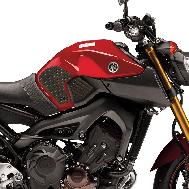 Eazi-Grip EVO - the non-abrasive high traction tank grips Yamaha MT-09 EVO Tank Grips includes Tank Grips, left and right side, black IPA cleaner Fitting Instructions Manufactured in the UK from high quality polyurethane, these traction pads are designed to be applied to the fuel tank recesses next to the riders knees and come pre-cut to size. High quality polyurethane with soft but durable domed surface Improves rider control in corners and under braking with minimal effort Non-abrasive - kind to riders clothing and leathers Cut to size - quick and easy to apply - instructions and IPA surface cleaner provided Application Peel back part of the release liner then press the tank grip firmly onto the tank and slowly peel back the liner whilst applying the grip. Push down the surface and take care not to trap air bubbles as you go. Allow 48 hours for the adhesive to fully bond before using the grips. Use an IPA cleaner to prepare surface area NO methylated spirits/petrol/lighter fluid etc. as these leave behind a thin, greasy residue. For best results ensure prepared surface is above 10oC. Also available - Eazi-Grip PRO Tank Grips Race developed in BSB and Isle of Man TT for the more aggressive race or track-day rider, Eazi-Grip PRO Tank Grips features a unique, circular embossed pattern, with a flatter, lower profile that combines excellent grip and durability with exceptional rider feel. Eazi-Grip PRO Tank Grips have been specifically designed to allow greater movement on the bike whilst giving high levels of grip when needed through corners and under heavy braking. Designed, developed and manufactured in the U.K. Hint: Black grips look better than clear on a black tank, where clear grips can appear a little blue. Black grips can also look better than clear on a pure white tank, where clear grips can appear a little yellow. Clear grips are optimised for colours other than black and pure white. Suitable for Yamaha MT-09 2013 - current models only Part No. EVO915BL