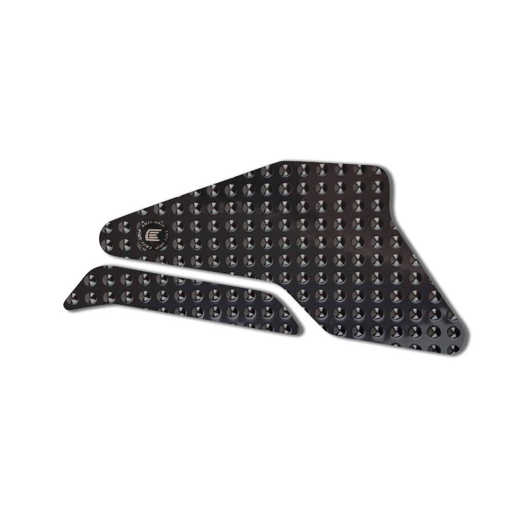 Eazi-Grip EVO - the non-abrasive high traction tank grips Yamaha MT-09 Tracer EVO Tank Grips includes Tank Grips, left and right side, black IPA cleaner Fitting Instructions Manufactured in the UK from high quality polyurethane, these traction pads are designed to be applied to the fuel tank recesses next to the riders knees and come pre-cut to size. High quality polyurethane with soft but durable domed surface Improves rider control in corners and under braking with minimal effort Non-abrasive - kind to riders clothing and leathers Cut to size - quick and easy to apply - instructions and IPA surface cleaner provided Application Peel back part of the release liner then press the tank grip firmly onto the tank and slowly peel back the liner whilst applying the grip. Push down the surface and take care not to trap air bubbles as you go. Allow 48 hours for the adhesive to fully bond before using the grips. Use an IPA cleaner to prepare surface area NO methylated spirits/petrol/lighter fluid etc. as these leave behind a thin, greasy residue. For best results ensure prepared surface is above 10oC. Also available - Eazi-Grip PRO Tank Grips Race developed in BSB and Isle of Man TT for the more aggressive race or track-day rider, Eazi-Grip PRO Tank Grips features a unique, circular embossed pattern, with a flatter, lower profile that combines excellent grip and durability with exceptional rider feel. Eazi-Grip PRO Tank Grips have been specifically designed to allow greater movement on the bike whilst giving high levels of grip when needed through corners and under heavy braking. Designed, developed and manufactured in the U.K. Hint: Black grips look better than clear on a black tank, where clear grips can appear a little blue. Black grips can also look better than clear on a pure white tank, where clear grips can appear a little yellow. Clear grips are optimised for colours other than black and pure white. Suitable for Yamaha MT-09 Tracer 2015 - current models only Part No. EVO921BL