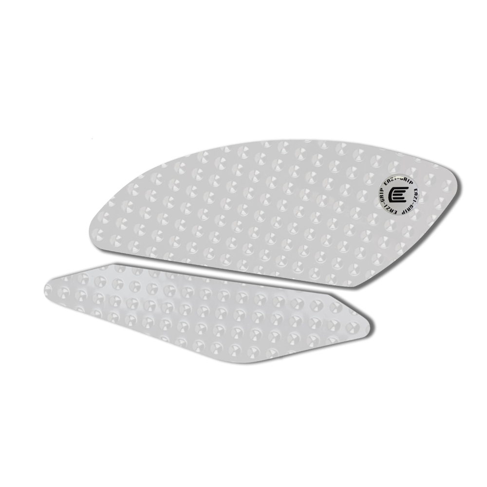 Eazi-Grip EVO - the non-abrasive high traction tank grips Yamaha YZF-R1 EVO Tank Grips includes Tank Grips, left and right side, clear IPA cleaner Fitting Instructions Manufactured in the UK from high quality polyurethane, these traction pads are designed to be applied to the fuel tank recesses next to the riders knees and come pre-cut to size. High quality polyurethane with soft but durable domed surface Improves rider control in corners and under braking with minimal effort Non-abrasive - kind to riders clothing and leathers Cut to size - quick and easy to apply - instructions and IPA surface cleaner provided Application Peel back part of the release liner then press the tank grip firmly onto the tank and slowly peel back the liner whilst applying the grip. Push down the surface and take care not to trap air bubbles as you go. Allow 48 hours for the adhesive to fully bond before using the grips. Use an IPA cleaner to prepare surface area NO methylated spirits/petrol/lighter fluid etc. as these leave behind a thin, greasy residue. For best results ensure prepared surface is above 10oC. Also available - Eazi-Grip PRO Tank Grips Race developed in BSB and Isle of Man TT for the more aggressive race or track-day rider, Eazi-Grip PRO Tank Grips features a unique, circular embossed pattern, with a flatter, lower profile that combines excellent grip and durability with exceptional rider feel. Eazi-Grip PRO Tank Grips have been specifically designed to allow greater movement on the bike whilst giving high levels of grip when needed through corners and under heavy braking. Designed, developed and manufactured in the U.K. Hint: Black grips look better than clear on a black tank, where clear grips can appear a little blue. Black grips can also look better than clear on a pure white tank, where clear grips can appear a little yellow. Clear grips are optimised for colours other than black and pure white. NB. Clear grips are supplied with a pink-coloured adhesive liner which makes the grips appear pink until the liner is removed. Suitable for Yamaha YZF-R1 2004 - 2006 models only Part No. EVO902CL