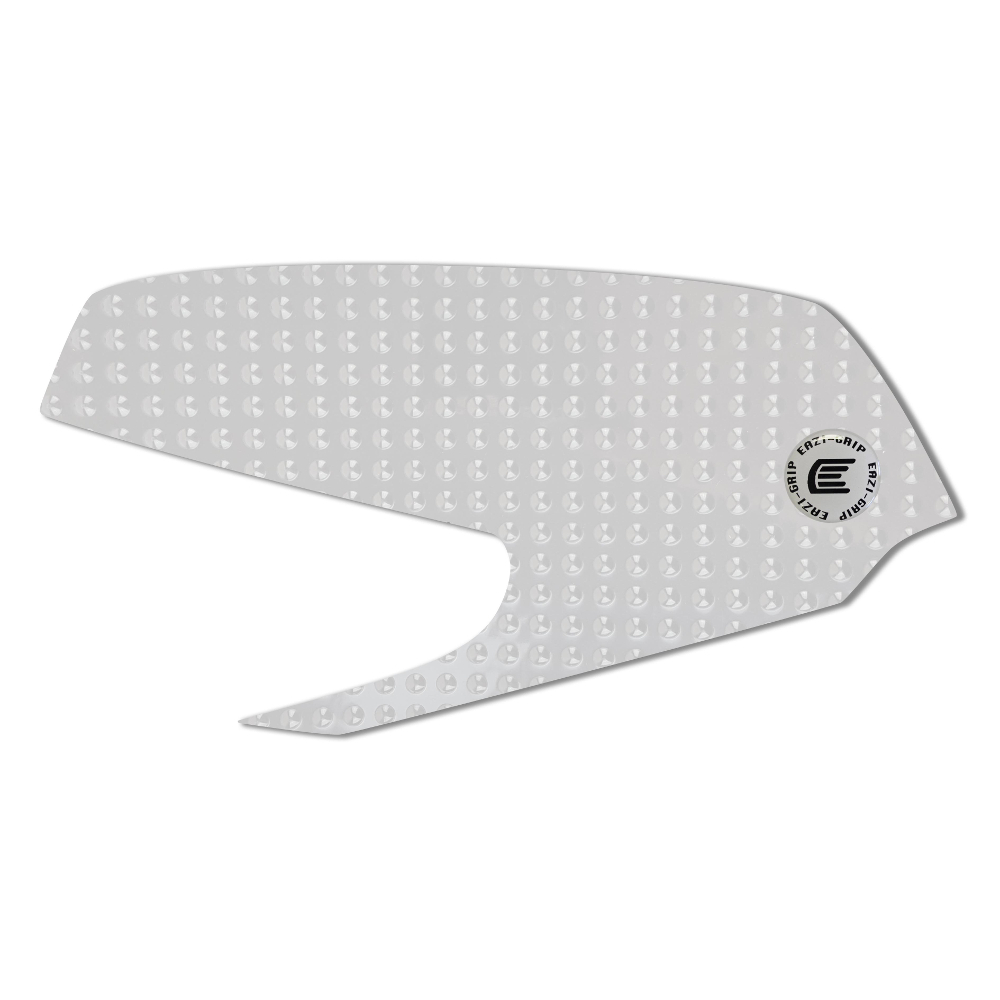 Eazi-Grip EVO - the non-abrasive high traction tank grips Yamaha YZF-R3 EVO Tank Grips includes Tank Grips, left and right side, clear IPA cleaner Fitting Instructions Manufactured in the UK from high quality polyurethane, these traction pads are designed to be applied to the fuel tank recesses next to the riders knees and come pre-cut to size. High quality polyurethane with soft but durable domed surface Improves rider control in corners and under braking with minimal effort Non-abrasive - kind to riders clothing and leathers Cut to size - quick and easy to apply - instructions and IPA surface cleaner provided Application Peel back part of the release liner then press the tank grip firmly onto the tank and slowly peel back the liner whilst applying the grip. Push down the surface and take care not to trap air bubbles as you go. Allow 48 hours for the adhesive to fully bond before using the grips. Use an IPA cleaner to prepare surface area NO methylated spirits/petrol/lighter fluid etc. as these leave behind a thin, greasy residue. For best results ensure prepared surface is above 10oC. Also available - Eazi-Grip PRO Tank Grips Race developed in BSB and Isle of Man TT for the more aggressive race or track-day rider, Eazi-Grip PRO Tank Grips features a unique, circular embossed pattern, with a flatter, lower profile that combines excellent grip and durability with exceptional rider feel. Eazi-Grip PRO Tank Grips have been specifically designed to allow greater movement on the bike whilst giving high levels of grip when needed through corners and under heavy braking. Designed, developed and manufactured in the U.K. Hint: Black grips look better than clear on a black tank, where clear grips can appear a little blue. Black grips can also look better than clear on a pure white tank, where clear grips can appear a little yellow. Clear grips are optimised for colours other than black and pure white. NB. Clear grips are supplied with a pink-coloured adhesive liner which makes the grips appear pink until the liner is removed. Suitable for Yamaha YZF-R3 2019 - current models only Part No. EVO934CL