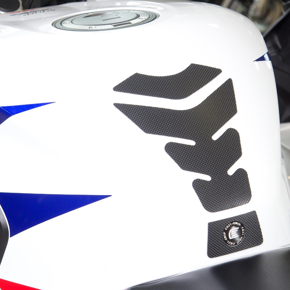 Eazi-Grip PRO - the non-abrasive high performance tank pads PRO Centre Tank Pad 142mm x 208mm, black Manufactured in the UK from high quality polyurethane, this Centre Tank Pad is designed to be applied along the centre of the fuel tank and to complement Eazi-Grip PRO Tank Grips for a uniform look. Please check pad dimensions to ensure the size is suitable for your bike. Eazi-Grip PRO Centre Tank Pads feature a unique, circular embossed pattern, with a flatter, lower profile that combines excellent grip and durability with exceptional rider feel. PRO Centre Tank Pads have been specifically designed to help protect your tank from wear and scratches caused by zips and buckles whilst offering additional grip when needed through corners and under heavy braking. High quality polyurethane with low profile, circular embossed surface Helps protect your tank from wear and scratching caused by zips and buckles Provides outstanding feel and movement but with superior grip when needed Non-abrasive - kind to riders leathers Application instructions and IPA surface cleaner provided Application Use the IPA cleaner to prepare surface area - NO methylated spirits/petrol/lighter fluid etc. as these leave behind a thin, greasy residue. For best results ensure prepared surface is above 10oC. Peel back part of the release liner then press the tank pad firmly onto the tank and slowly peel back the liner whilst applying the pad. Push down the surface and take care not to trap air bubbles as you go. Allow 48 hours for the adhesive to fully bond before using the pad. Also available from our store - Eazi-Grip EVO CentreTank Pads Eazi-Grip EVO Centre Tank Pads have a soft but durable domed surface that is very easy to grip, giving the rider increased control with minimal effort, thereby reducing fatigue and and reducing wear to the riders leathers or clothing. Eazi-Grip EVO Centre Tank Pads are designed to match our EVO Tank Grips for a uniform look. Suitable for a wide range of motorcycles Part No. PROCENTREPADGBL