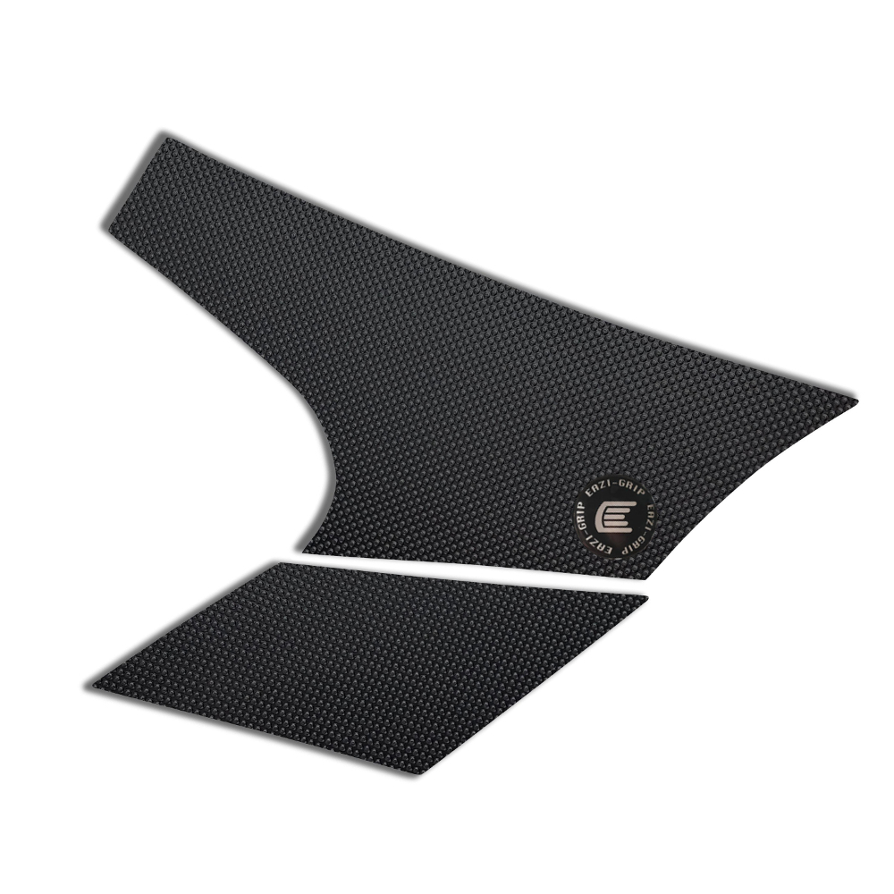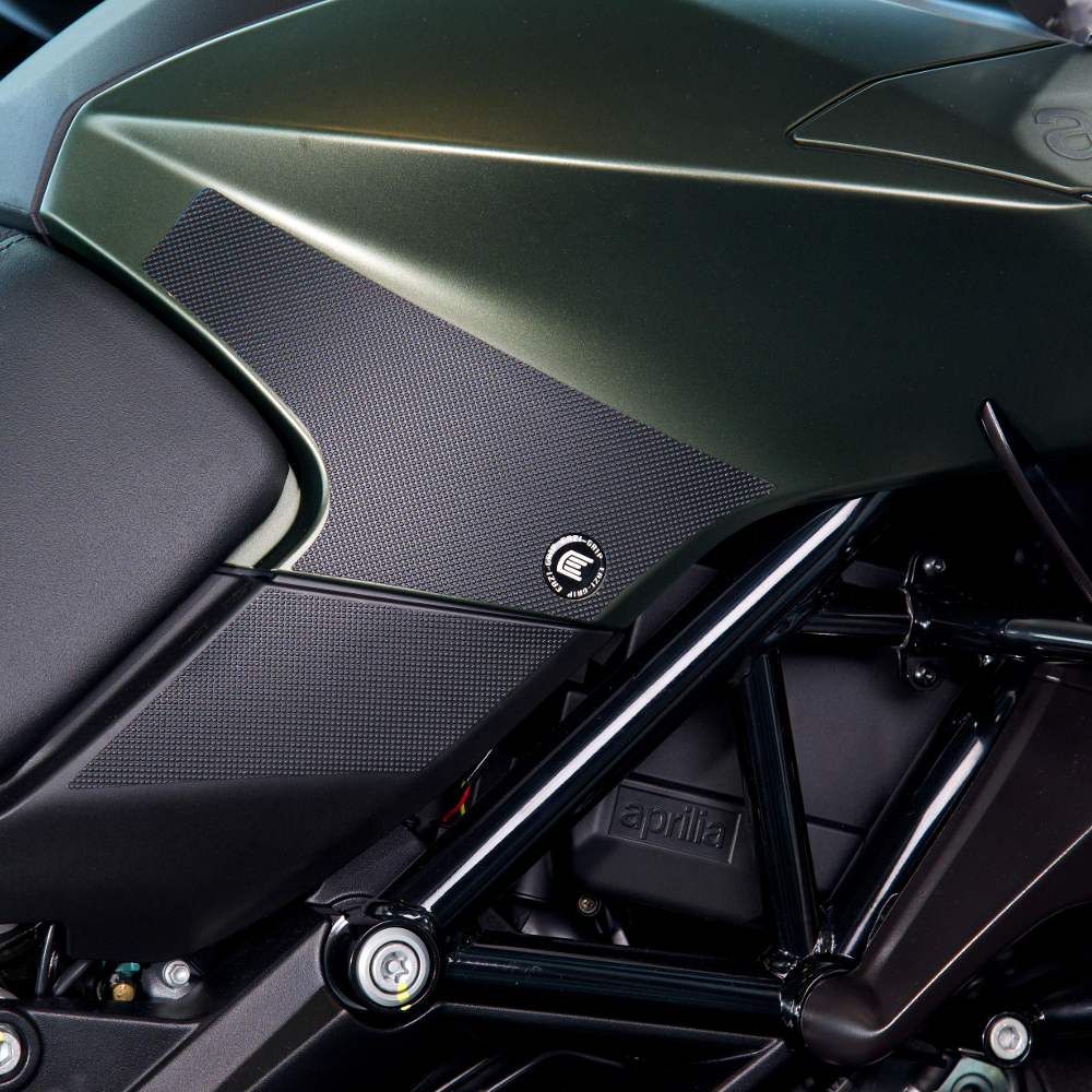 Eazi-Grip PRO - the non-abrasive high performance tank grips Aprilia Caponord 1200 PRO Tank Grips includes Tank Grips, left and right side, black IPA cleaner Fitting Instructions Manufactured in the UK from high quality polyurethane, these traction pads are designed to be applied to the fuel tank recesses next to the riders knees and come pre-cut to size. High quality polyurethane with low profile, circular embossed surface Provides outstanding feel and movement but with superior grip when needed Suitable for race, track days and more enthusiastic road riders Non-abrasive - kind to riders leathers Cut to size - quick and easy to apply - instructions and IPA surface cleaner provided Road and track use only - not suitable for off-road use Application Peel back part of the release liner then press the tank grip firmly onto the tank and slowly peel back the liner whilst applying the grip. Push down the surface and take care not to trap air bubbles as you go. Allow 48 hours for the adhesive to fully bond before using the grips. Use an IPA cleaner to prepare surface area NO methylated spirits/petrol/lighter fluid etc. as these leave behind a thin, greasy residue. For best results ensure prepared surface is above 10oC. Also available from our store - Eazi-Grip EVO Tank Grips Eazi-Grip EVO tank grips have a soft but durable domed surface that is very easy to grip, giving the rider increased control with minimal effort, thereby reducing fatigue and and reducing wear to the riders leathers or clothing. Eazi-Grip EVO Tank Grips tend to suit the less aggressive rider (primarily road and occassional track use) and are a great alternative to more abrasive, higher priced tank grips available on the market. Designed, developed and manufactured in the U.K. Hint: Black grips look better than clear on a black tank, where clear grips can appear a little blue. Black grips can also look better than clear on a pure white tank, where clear grips can appear a little yellow. Clear grips are optimised for colours other than black and pure white. Suitable for Caponord 1200 2013 - current models Part No. PRO007BL