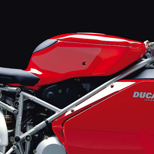 Eazi-Grip PRO - the non-abrasive high performance tank grips Ducati 749 and 999 PRO Tank Grips includes Tank Grips, left and right side, clear IPA cleaner Fitting Instructions Manufactured in the UK from high quality polyurethane, these traction pads are designed to be applied to the fuel tank recesses next to the riders knees and come pre-cut to size. High quality polyurethane with low profile, circular embossed surface Provides outstanding feel and movement but with superior grip when needed Suitable for race, track days and more enthusiastic road riders Non-abrasive - kind to riders leathers Cut to size - quick and easy to apply - instructions and IPA surface cleaner provided Road and track use only - not suitable for off-road use Application Peel back part of the release liner then press the tank grip firmly onto the tank and slowly peel back the liner whilst applying the grip. Push down the surface and take care not to trap air bubbles as you go. Allow 48 hours for the adhesive to fully bond before using the grips. Use an IPA cleaner to prepare surface area NO methylated spirits/petrol/lighter fluid etc. as these leave behind a thin, greasy residue. For best results ensure prepared surface is above 10oC. Also available from our store - Eazi-Grip EVO Tank Grips Eazi-Grip EVO tank grips have a soft but durable domed surface that is very easy to grip, giving the rider increased control with minimal effort, thereby reducing fatigue and and reducing wear to the riders leathers or clothing. Eazi-Grip EVO Tank Grips tend to suit the less aggressive rider (primarily road and occassional track use) and are a great alternative to more abrasive, higher priced tank grips available on the market. Designed, developed and manufactured in the U.K. Hint: Black grips look better than clear on a black tank, where clear grips can appear a little blue. Black grips can also look better than clear on a pure white tank, where clear grips can appear a little yellow. Clear grips are optimised for colours other than black and pure white. NB. Clear grips are supplied with a pink-coloured adhesive liner which makes the grips appear pink until the liner is removed. Suitable for Ducati 749 and 999 models Part No. PRO209CL