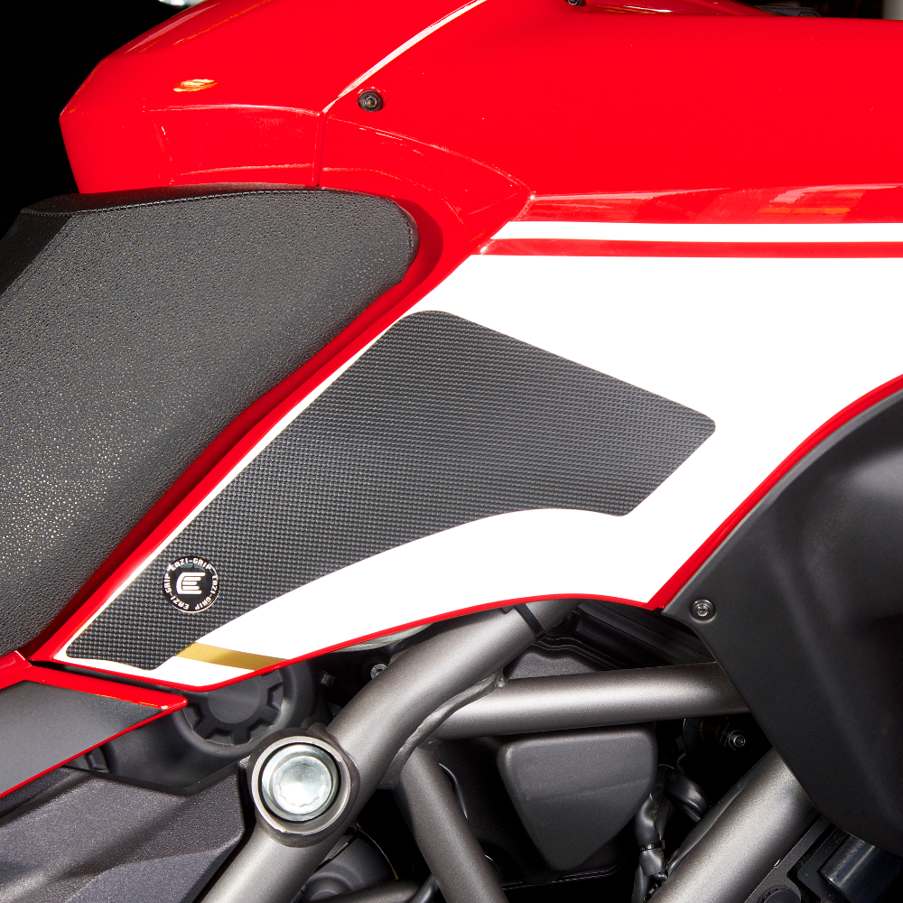 Eazi-Grip PRO - the non-abrasive high performance tank grips Ducati Multistrada 1200 1200S PRO Tank Grips includes Tank Grips, left and right side, black IPA cleaner Fitting Instructions Manufactured in the UK from high quality polyurethane, these traction pads are designed to be applied to the fuel tank recesses next to the riders knees and come pre-cut to size. High quality polyurethane with low profile, circular embossed surface Provides outstanding feel and movement but with superior grip when needed Suitable for race, track days and more enthusiastic road riders Non-abrasive - kind to riders leathers Cut to size - quick and easy to apply - instructions and IPA surface cleaner provided Road and track use only - not suitable for off-road use Application Peel back part of the release liner then press the tank grip firmly onto the tank and slowly peel back the liner whilst applying the grip. Push down the surface and take care not to trap air bubbles as you go. Allow 48 hours for the adhesive to fully bond before using the grips. Use an IPA cleaner to prepare surface area NO methylated spirits/petrol/lighter fluid etc. as these leave behind a thin, greasy residue. For best results ensure prepared surface is above 10oC. Also available from our store - Eazi-Grip EVO Tank Grips Eazi-Grip EVO tank grips have a soft but durable domed surface that is very easy to grip, giving the rider increased control with minimal effort, thereby reducing fatigue and and reducing wear to the riders leathers or clothing. Eazi-Grip EVO Tank Grips tend to suit the less aggressive rider (primarily road and occassional track use) and are a great alternative to more abrasive, higher priced tank grips available on the market. Designed, developed and manufactured in the U.K. Hint: Black grips look better than clear on a black tank, where clear grips can appear a little blue. Black grips can also look better than clear on a pure white tank, where clear grips can appear a little yellow. Clear grips are optimised for colours other than black and pure white. Suitable for Ducati Multistrada 1200 1200S 2010 - 2016 models only Part No. PRO211BL