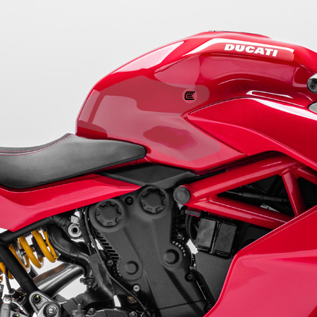 Eazi-Grip PRO - the non-abrasive high performance tank grips Ducati SuperSport PRO Tank Grips includes Tank Grips, left and right side, clear IPA cleaner Fitting Instructions Manufactured in the UK from high quality polyurethane, these traction pads are designed to be applied to the fuel tank recesses next to the riders knees and come pre-cut to size. High quality polyurethane with low profile, circular embossed surface Provides outstanding feel and movement but with superior grip when needed Suitable for race, track days and more enthusiastic road riders Non-abrasive - kind to riders leathers Cut to size - quick and easy to apply - instructions and IPA surface cleaner provided Road and track use only - not suitable for off-road use Application Peel back part of the release liner then press the tank grip firmly onto the tank and slowly peel back the liner whilst applying the grip. Push down the surface and take care not to trap air bubbles as you go. Allow 48 hours for the adhesive to fully bond before using the grips. Use an IPA cleaner to prepare surface area NO methylated spirits/petrol/lighter fluid etc. as these leave behind a thin, greasy residue. For best results ensure prepared surface is above 10oC. Also available from our store - Eazi-Grip EVO Tank Grips Eazi-Grip EVO tank grips have a soft but durable domed surface that is very easy to grip, giving the rider increased control with minimal effort, thereby reducing fatigue and and reducing wear to the riders leathers or clothing. Eazi-Grip EVO Tank Grips tend to suit the less aggressive rider (primarily road and occassional track use) and are a great alternative to more abrasive, higher priced tank grips available on the market. Designed, developed and manufactured in the U.K. Hint: Black grips look better than clear on a black tank, where clear grips can appear a little blue. Black grips can also look better than clear on a pure white tank, where clear grips can appear a little yellow. Clear grips are optimised for colours other than black and pure white. NB. Clear grips are supplied with a pink-coloured adhesive liner which makes the grips appear pink until the liner is removed. Suitable for Ducati SuperSport 2017 - current models Part No. PRO221CL
