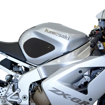 Eazi-Grip PRO - the non-abrasive high performance tank grips Kawasaki Ninja ZX-6R 636 PRO Tank Grips includes Tank Grips, left and right side, black IPA cleaner Fitting Instructions Manufactured in the UK from high quality polyurethane, these traction pads are designed to be applied to the fuel tank recesses next to the riders knees and come pre-cut to size. High quality polyurethane with low profile, circular embossed surface Provides outstanding feel and movement but with superior grip when needed Suitable for race, track days and more enthusiastic road riders Non-abrasive - kind to riders leathers Cut to size - quick and easy to apply - instructions and IPA surface cleaner provided Road and track use only - not suitable for off-road use Application Peel back part of the release liner then press the tank grip firmly onto the tank and slowly peel back the liner whilst applying the grip. Push down the surface and take care not to trap air bubbles as you go. Allow 48 hours for the adhesive to fully bond before using the grips. Use an IPA cleaner to prepare surface area NO methylated spirits/petrol/lighter fluid etc. as these leave behind a thin, greasy residue. For best results ensure prepared surface is above 10oC. Also available from our store - Eazi-Grip EVO Tank Grips Eazi-Grip EVO tank grips have a soft but durable domed surface that is very easy to grip, giving the rider increased control with minimal effort, thereby reducing fatigue and and reducing wear to the riders leathers or clothing. Eazi-Grip EVO Tank Grips tend to suit the less aggressive rider (primarily road and occassional track use) and are a great alternative to more abrasive, higher priced tank grips available on the market. Designed, developed and manufactured in the U.K. Hint: Black grips look better than clear on a black tank, where clear grips can appear a little blue. Black grips can also look better than clear on a pure white tank, where clear grips can appear a little yellow. Clear grips are optimised for colours other than black and pure white. Suitable for Kawasaki Ninja ZX-6R 636 2003 - 2004 models only Part No. PRO405BL