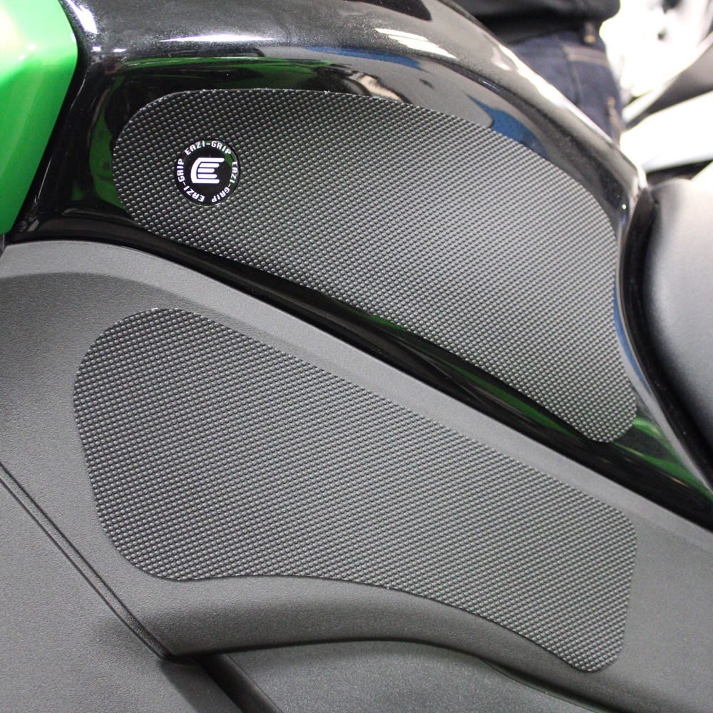 Eazi-Grip PRO - the non-abrasive high performance tank grips Kawasaki Versys 1000 PRO Tank Grips includes Tank Grips, left and right side, black IPA cleaner Fitting Instructions Manufactured in the UK from high quality polyurethane, these traction pads are designed to be applied to the fuel tank recesses next to the riders knees and come pre-cut to size. High quality polyurethane with low profile, circular embossed surface Provides outstanding feel and movement but with superior grip when needed Suitable for race, track days and more enthusiastic road riders Non-abrasive - kind to riders leathers Cut to size - quick and easy to apply - instructions and IPA surface cleaner provided Road and track use only - not suitable for off-road use Application Peel back part of the release liner then press the tank grip firmly onto the tank and slowly peel back the liner whilst applying the grip. Push down the surface and take care not to trap air bubbles as you go. Allow 48 hours for the adhesive to fully bond before using the grips. Use an IPA cleaner to prepare surface area NO methylated spirits/petrol/lighter fluid etc. as these leave behind a thin, greasy residue. For best results ensure prepared surface is above 10oC. Also available from our store - Eazi-Grip EVO Tank Grips Eazi-Grip EVO tank grips have a soft but durable domed surface that is very easy to grip, giving the rider increased control with minimal effort, thereby reducing fatigue and and reducing wear to the riders leathers or clothing. Eazi-Grip EVO Tank Grips tend to suit the less aggressive rider (primarily road and occassional track use) and are a great alternative to more abrasive, higher priced tank grips available on the market. Designed, developed and manufactured in the U.K. Hint: Black grips look better than clear on a black tank, where clear grips can appear a little blue. Black grips can also look better than clear on a pure white tank, where clear grips can appear a little yellow. Clear grips are optimised for colours other than black and pure white. Suitable for Kawasaki Versys 1000 2012 - 2018 models only Part No. PRO423BL