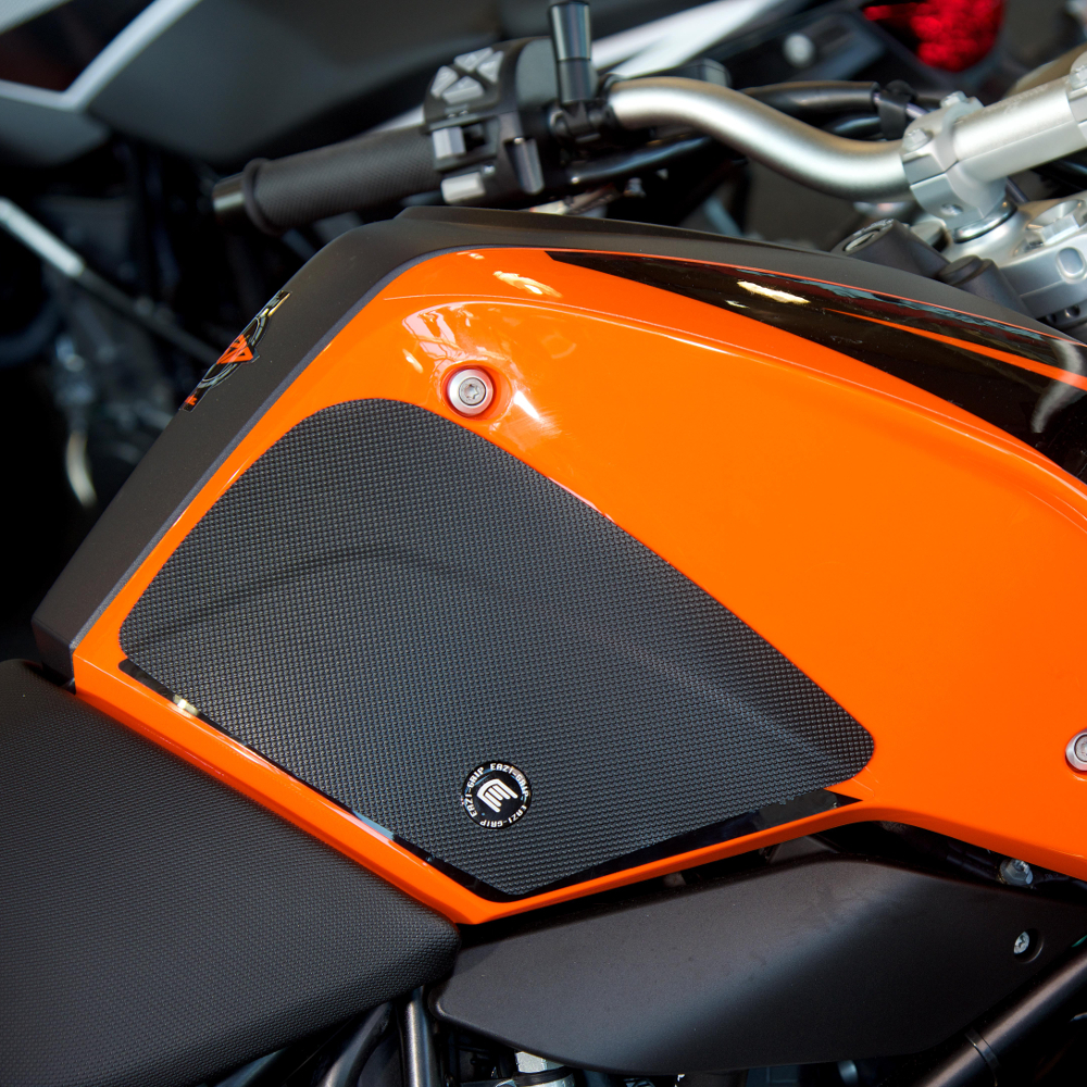 Eazi-Grip PRO - the non-abrasive high performance tank grips KTM 690 Duke / R PRO Tank Grips includes Tank Grips, left and right side, black IPA cleaner Fitting Instructions Manufactured in the UK from high quality polyurethane, these traction pads are designed to be applied to the fuel tank recesses next to the riders knees and come pre-cut to size. High quality polyurethane with low profile, circular embossed surface Provides outstanding feel and movement but with superior grip when needed Suitable for race, track days and more enthusiastic road riders Non-abrasive - kind to riders leathers Cut to size - quick and easy to apply - instructions and IPA surface cleaner provided Road and track use only - not suitable for off-road use Application Peel back part of the release liner then press the tank grip firmly onto the tank and slowly peel back the liner whilst applying the grip. Push down the surface and take care not to trap air bubbles as you go. Allow 48 hours for the adhesive to fully bond before using the grips. Use an IPA cleaner to prepare surface area NO methylated spirits/petrol/lighter fluid etc. as these leave behind a thin, greasy residue. For best results ensure prepared surface is above 10oC. Also available from our store - Eazi-Grip EVO Tank Grips Eazi-Grip EVO tank grips have a soft but durable domed surface that is very easy to grip, giving the rider increased control with minimal effort, thereby reducing fatigue and and reducing wear to the riders leathers or clothing. Eazi-Grip EVO Tank Grips tend to suit the less aggressive rider (primarily road and occassional track use) and are a great alternative to more abrasive, higher priced tank grips available on the market. Designed, developed and manufactured in the U.K. Hint: Black grips look better than clear on a black tank, where clear grips can appear a little blue. Black grips can also look better than clear on a pure white tank, where clear grips can appear a little yellow. Clear grips are optimised for colours other than black and pure white. Suitable for KTM 690 Duke / R 2011 - 2018 models only Part No. PRO504BL