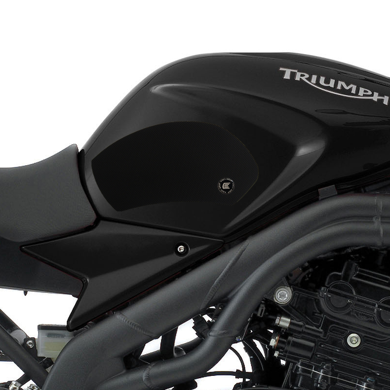 Eazi-Grip PRO - the non-abrasive high performance tank grips Triumph Speed Triple PRO Tank Grips includes Tank Grips, left and right side, black IPA cleaner Fitting Instructions Manufactured in the UK from high quality polyurethane, these traction pads are designed to be applied to the fuel tank recesses next to the riders knees and come pre-cut to size. High quality polyurethane with low profile, circular embossed surface Provides outstanding feel and movement but with superior grip when needed Suitable for race, track days and more enthusiastic road riders Non-abrasive - kind to riders leathers Cut to size - quick and easy to apply - instructions and IPA surface cleaner provided Road and track use only - not suitable for off-road use Application Peel back part of the release liner then press the tank grip firmly onto the tank and slowly peel back the liner whilst applying the grip. Push down the surface and take care not to trap air bubbles as you go. Allow 48 hours for the adhesive to fully bond before using the grips. Use an IPA cleaner to prepare surface area NO methylated spirits/petrol/lighter fluid etc. as these leave behind a thin, greasy residue. For best results ensure prepared surface is above 10oC. Also available from our store - Eazi-Grip EVO Tank Grips Eazi-Grip EVO tank grips have a soft but durable domed surface that is very easy to grip, giving the rider increased control with minimal effort, thereby reducing fatigue and and reducing wear to the riders leathers or clothing. Eazi-Grip EVO Tank Grips tend to suit the less aggressive rider (primarily road and occassional track use) and are a great alternative to more abrasive, higher priced tank grips available on the market. Designed, developed and manufactured in the U.K. Hint: Black grips look better than clear on a black tank, where clear grips can appear a little blue. Black grips can also look better than clear on a pure white tank, where clear grips can appear a little yellow. Clear grips are optimised for colours other than black and pure white. Suitable for Triumph Speed Triple 2005 - 2010 models only Part No. PRO810BL