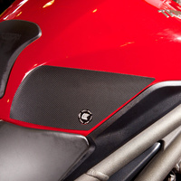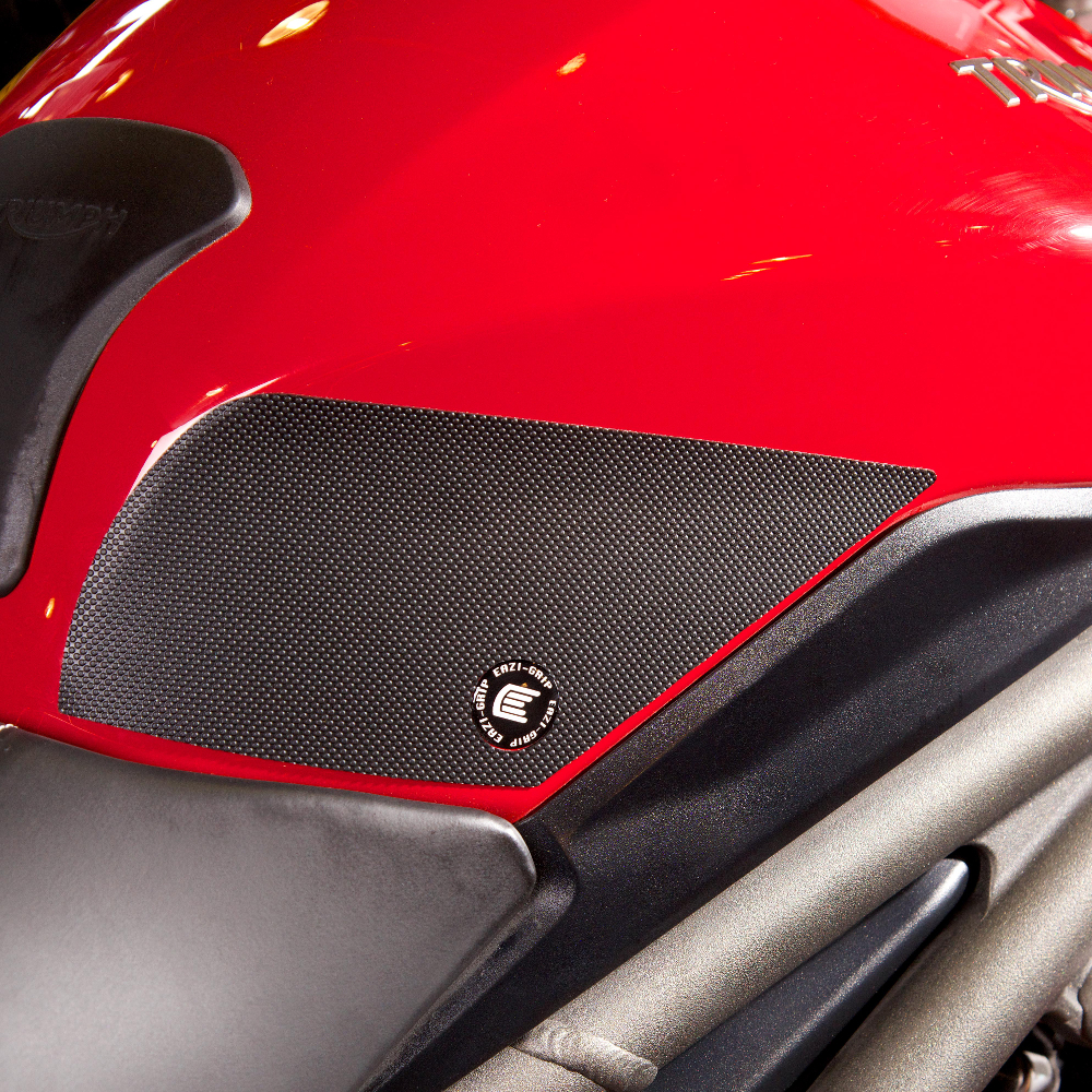 Eazi-Grip PRO - the non-abrasive high performance tank grips Triumph Speed Triple / S / R PRO Tank Grips includes Tank Grips, left and right side, black IPA cleaner Fitting Instructions Manufactured in the UK from high quality polyurethane, these traction pads are designed to be applied to the fuel tank recesses next to the riders knees and come pre-cut to size. High quality polyurethane with low profile, circular embossed surface Provides outstanding feel and movement but with superior grip when needed Suitable for race, track days and more enthusiastic road riders Non-abrasive - kind to riders leathers Cut to size - quick and easy to apply - instructions and IPA surface cleaner provided Road and track use only - not suitable for off-road use Application Peel back part of the release liner then press the tank grip firmly onto the tank and slowly peel back the liner whilst applying the grip. Push down the surface and take care not to trap air bubbles as you go. Allow 48 hours for the adhesive to fully bond before using the grips. Use an IPA cleaner to prepare surface area NO methylated spirits/petrol/lighter fluid etc. as these leave behind a thin, greasy residue. For best results ensure prepared surface is above 10oC. Also available from our store - Eazi-Grip EVO Tank Grips Eazi-Grip EVO tank grips have a soft but durable domed surface that is very easy to grip, giving the rider increased control with minimal effort, thereby reducing fatigue and and reducing wear to the riders leathers or clothing. Eazi-Grip EVO Tank Grips tend to suit the less aggressive rider (primarily road and occassional track use) and are a great alternative to more abrasive, higher priced tank grips available on the market. Designed, developed and manufactured in the U.K. Hint: Black grips look better than clear on a black tank, where clear grips can appear a little blue. Black grips can also look better than clear on a pure white tank, where clear grips can appear a little yellow. Clear grips are optimised for colours other than black and pure white. Suitable for Triumph Speed Triple / S / R 2016 - current models only Part No. PRO811BL
