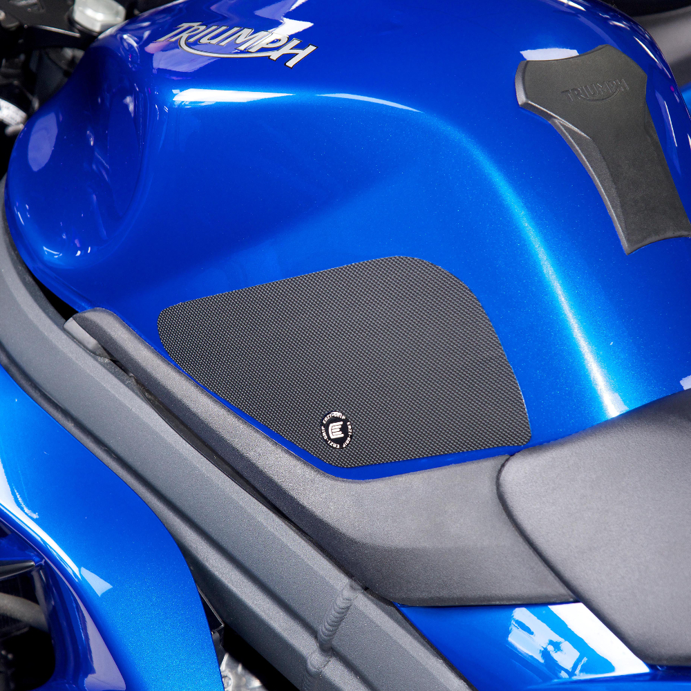 Eazi-Grip PRO - the non-abrasive high performance tank grips Triumph Sprint ST PRO Tank Grips includes Tank Grips, left and right side, black IPA cleaner Fitting Instructions Manufactured in the UK from high quality polyurethane, these traction pads are designed to be applied to the fuel tank recesses next to the riders knees and come pre-cut to size. High quality polyurethane with low profile, circular embossed surface Provides outstanding feel and movement but with superior grip when needed Suitable for race, track days and more enthusiastic road riders Non-abrasive - kind to riders leathers Cut to size - quick and easy to apply - instructions and IPA surface cleaner provided Road and track use only - not suitable for off-road use Application Peel back part of the release liner then press the tank grip firmly onto the tank and slowly peel back the liner whilst applying the grip. Push down the surface and take care not to trap air bubbles as you go. Allow 48 hours for the adhesive to fully bond before using the grips. Use an IPA cleaner to prepare surface area NO methylated spirits/petrol/lighter fluid etc. as these leave behind a thin, greasy residue. For best results ensure prepared surface is above 10oC. Also available from our store - Eazi-Grip EVO Tank Grips Eazi-Grip EVO tank grips have a soft but durable domed surface that is very easy to grip, giving the rider increased control with minimal effort, thereby reducing fatigue and and reducing wear to the riders leathers or clothing. Eazi-Grip EVO Tank Grips tend to suit the less aggressive rider (primarily road and occassional track use) and are a great alternative to more abrasive, higher priced tank grips available on the market. Designed, developed and manufactured in the U.K. Hint: Black grips look better than clear on a black tank, where clear grips can appear a little blue. Black grips can also look better than clear on a pure white tank, where clear grips can appear a little yellow. Clear grips are optimised for colours other than black and pure white. Suitable for Triumph Sprint ST 2005 - 2010, Sprint GT 2010 - 2015 models only Part No. PRO805BL