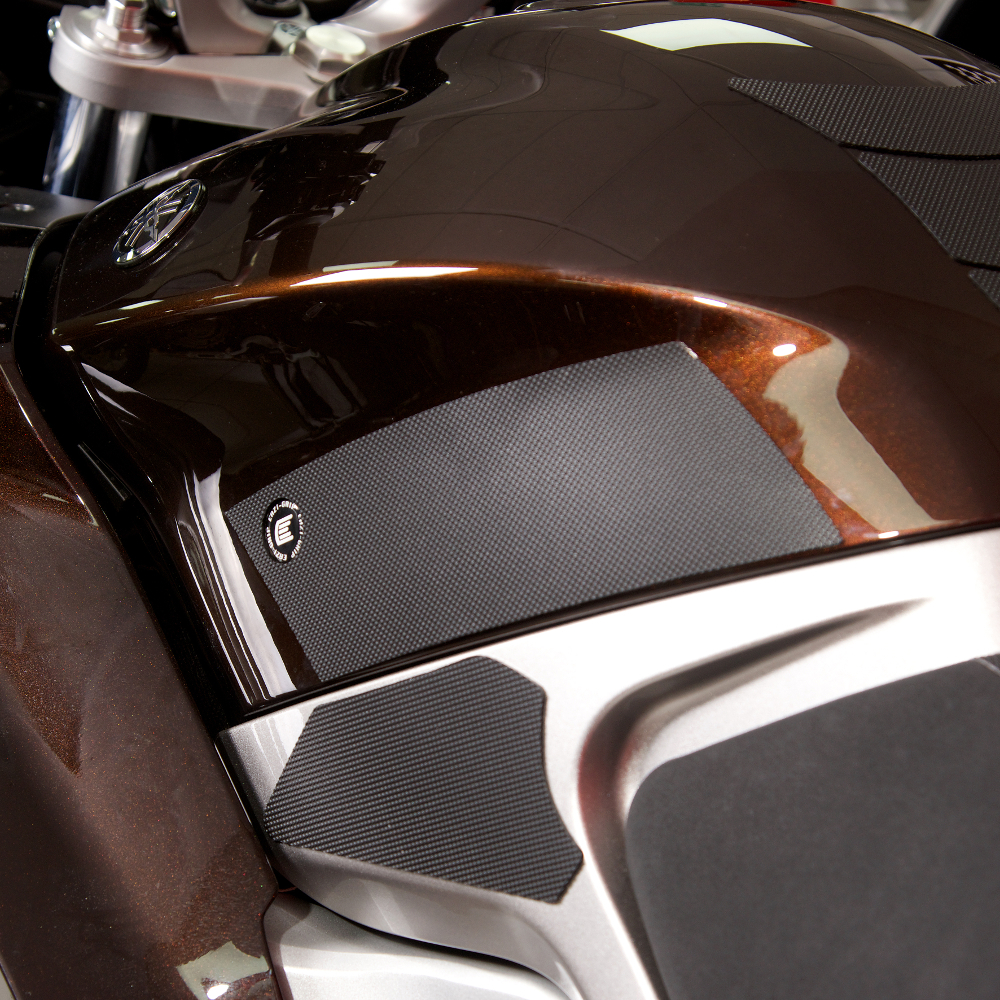 Eazi-Grip PRO - the non-abrasive high performance tank grips Yamaha FJR1300 PRO Tank Grips includes Tank Grips, left and right side, black IPA cleaner Fitting Instructions Manufactured in the UK from high quality polyurethane, these traction pads are designed to be applied to the fuel tank recesses next to the riders knees and come pre-cut to size. High quality polyurethane with low profile, circular embossed surface Provides outstanding feel and movement but with superior grip when needed Suitable for race, track days and more enthusiastic road riders Non-abrasive - kind to riders leathers Cut to size - quick and easy to apply - instructions and IPA surface cleaner provided Road and track use only - not suitable for off-road use Application Peel back part of the release liner then press the tank grip firmly onto the tank and slowly peel back the liner whilst applying the grip. Push down the surface and take care not to trap air bubbles as you go. Allow 48 hours for the adhesive to fully bond before using the grips. Use an IPA cleaner to prepare surface area NO methylated spirits/petrol/lighter fluid etc. as these leave behind a thin, greasy residue. For best results ensure prepared surface is above 10oC. Also available from our store - Eazi-Grip EVO Tank Grips Eazi-Grip EVO tank grips have a soft but durable domed surface that is very easy to grip, giving the rider increased control with minimal effort, thereby reducing fatigue and and reducing wear to the riders leathers or clothing. Eazi-Grip EVO Tank Grips tend to suit the less aggressive rider (primarily road and occassional track use) and are a great alternative to more abrasive, higher priced tank grips available on the market. Designed, developed and manufactured in the U.K. Hint: Black grips look better than clear on a black tank, where clear grips can appear a little blue. Black grips can also look better than clear on a pure white tank, where clear grips can appear a little yellow. Clear grips are optimised for colours other than black and pure white. Suitable for Yamaha FJR1300 2002 - current models only Part No. PRO923BL