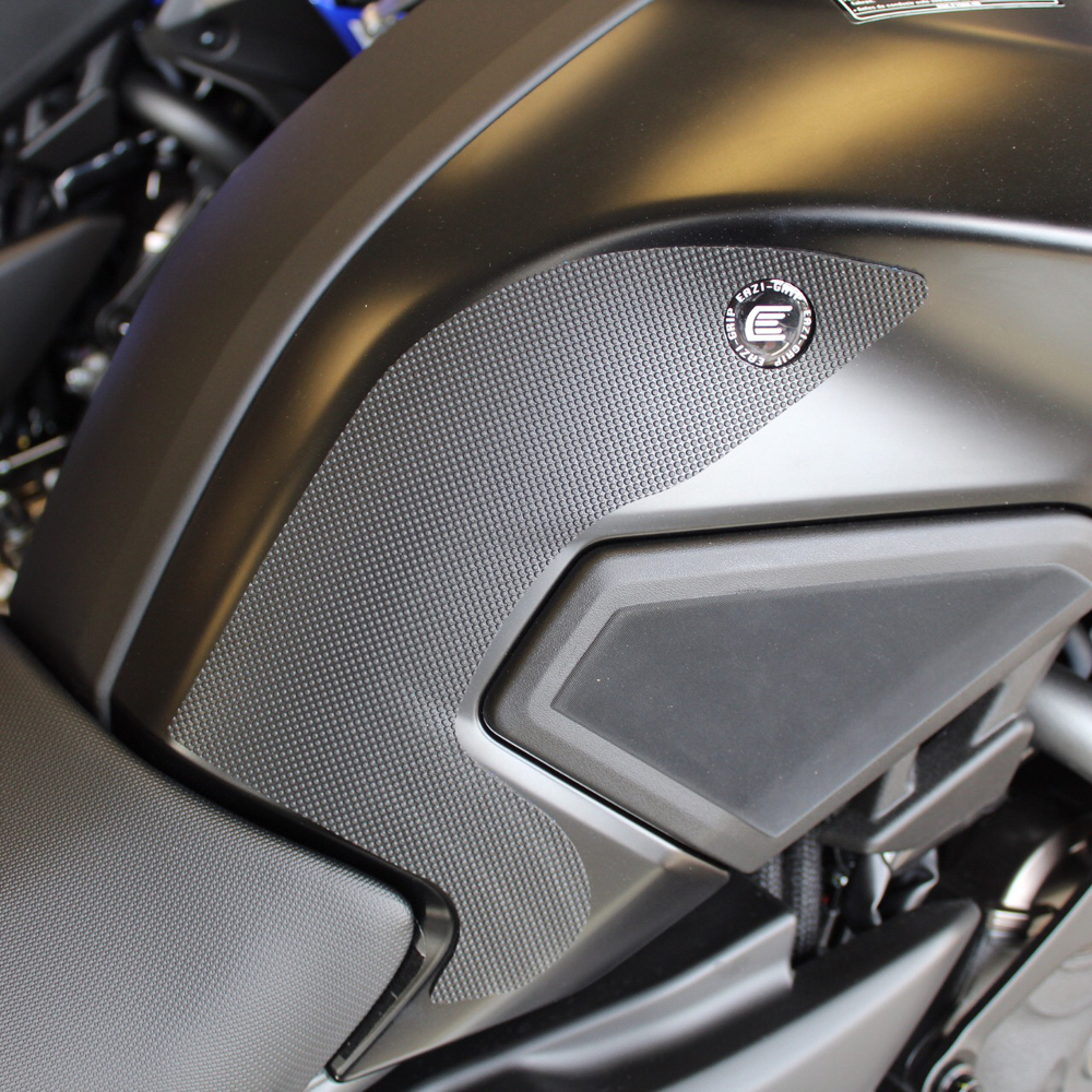 Eazi-Grip PRO - the non-abrasive high performance tank grips Yamaha MT-07 Tracer PRO Tank Grips includes Tank Grips, left and right side, black IPA cleaner Fitting Instructions Manufactured in the UK from high quality polyurethane, these traction pads are designed to be applied to the fuel tank recesses next to the riders knees and come pre-cut to size. High quality polyurethane with low profile, circular embossed surface Provides outstanding feel and movement but with superior grip when needed Suitable for race, track days and more enthusiastic road riders Non-abrasive - kind to riders leathers Cut to size - quick and easy to apply - instructions and IPA surface cleaner provided Road and track use only - not suitable for off-road use Application Peel back part of the release liner then press the tank grip firmly onto the tank and slowly peel back the liner whilst applying the grip. Push down the surface and take care not to trap air bubbles as you go. Allow 48 hours for the adhesive to fully bond before using the grips. Use an IPA cleaner to prepare surface area NO methylated spirits/petrol/lighter fluid etc. as these leave behind a thin, greasy residue. For best results ensure prepared surface is above 10oC. Also available from our store - Eazi-Grip EVO Tank Grips Eazi-Grip EVO tank grips have a soft but durable domed surface that is very easy to grip, giving the rider increased control with minimal effort, thereby reducing fatigue and and reducing wear to the riders leathers or clothing. Eazi-Grip EVO Tank Grips tend to suit the less aggressive rider (primarily road and occassional track use) and are a great alternative to more abrasive, higher priced tank grips available on the market. Designed, developed and manufactured in the U.K. Hint: Black grips look better than clear on a black tank, where clear grips can appear a little blue. Black grips can also look better than clear on a pure white tank, where clear grips can appear a little yellow. Clear grips are optimised for colours other than black and pure white. NB. Clear grips are supplied with a pink-coloured adhesive liner which makes the grips appear pink until the liner is removed. or black Suitable for Yamaha MT-07 Tracer 2017 - 2019 models only  Part No. PRO929BL