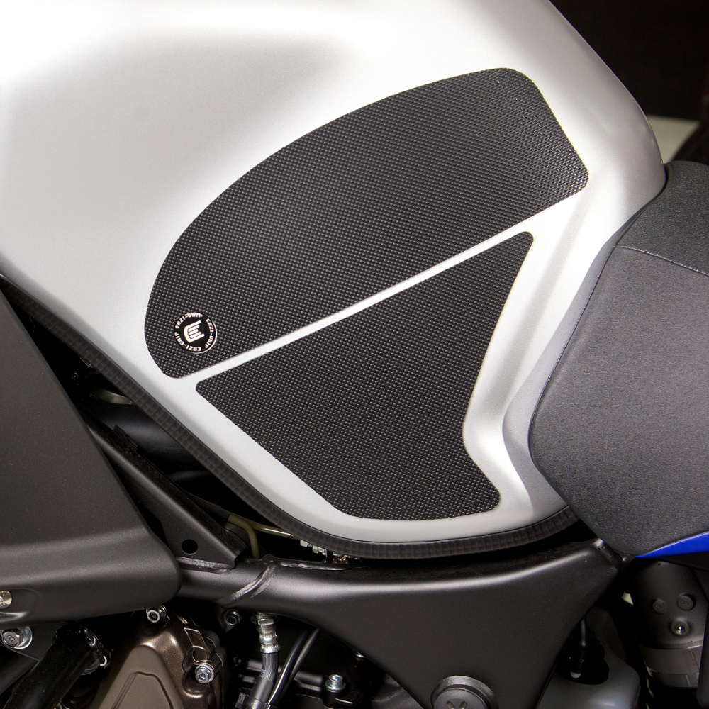 Eazi-Grip PRO - the non-abrasive high performance tank grips Yamaha XT1200 Super Tenere PRO Tank Grips includes Tank Grips, left and right side, black IPA cleaner Fitting Instructions Manufactured in the UK from high quality polyurethane, these traction pads are designed to be applied to the fuel tank recesses next to the riders knees and come pre-cut to size. High quality polyurethane with low profile, circular embossed surface Provides outstanding feel and movement but with superior grip when needed Suitable for race, track days and more enthusiastic road riders Non-abrasive - kind to riders leathers Cut to size - quick and easy to apply - instructions and IPA surface cleaner provided Road and track use only - not suitable for off-road use Application Peel back part of the release liner then press the tank grip firmly onto the tank and slowly peel back the liner whilst applying the grip. Push down the surface and take care not to trap air bubbles as you go. Allow 48 hours for the adhesive to fully bond before using the grips. Use an IPA cleaner to prepare surface area NO methylated spirits/petrol/lighter fluid etc. as these leave behind a thin, greasy residue. For best results ensure prepared surface is above 10oC. Also available from our store - Eazi-Grip EVO Tank Grips Eazi-Grip EVO tank grips have a soft but durable domed surface that is very easy to grip, giving the rider increased control with minimal effort, thereby reducing fatigue and and reducing wear to the riders leathers or clothing. Eazi-Grip EVO Tank Grips tend to suit the less aggressive rider (primarily road and occassional track use) and are a great alternative to more abrasive, higher priced tank grips available on the market. Designed, developed and manufactured in the U.K. Hint: Black grips look better than clear on a black tank, where clear grips can appear a little blue. Black grips can also look better than clear on a pure white tank, where clear grips can appear a little yellow. Clear grips are optimised for colours other than black and pure white. Suitable for Yamaha XT1200 Super Tenere 2011 - current models only Part No. PRO922BL