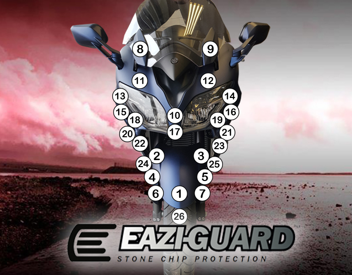 Race Developed Stone Chip Paint Protection from Eazi-Guard Yamaha FJR1300AE/AS Stone Chip Paint Protection    includes Pre-cut stone chip paint protection film Application solution Application tool Fitting Instructions  Eazi-Guard stone chip protection tape is an Ultra-Thin, Ultra-Tough, polyurethane protection film, designed to protect your bike and virtually eliminate damage. The unique properties of our Polyurethane Protection tape enable it to disperse the impact energy of gravel and small stones, bouncing them off and leaving your bodywork untouched beneath. Eazi-Guard uses a specially formulated acrylic adhesive which can be safely removed without residue, leaving your bike looking as great as the day you bought it. Eazi-Guard is supplied in a pre-cut kit format, has high elasticity, meaning that it is extremely conformable around even tight radii and compound curves, making it easy to fit. Gloss finish suited to bikes with gloss paint Specifically cut to size for a perfect fit Manufactured from high quality clear polyurethane Extremely pliant and conformable Designed to protect your bike and virtually eliminate damage Ideal for road and track bikes Detailed fitting instructions provided Developed and manufactured in the U.K. Suitable for Yamaha FJR1300AE/AS 2014 - current models only Part No. GUARDYAM007