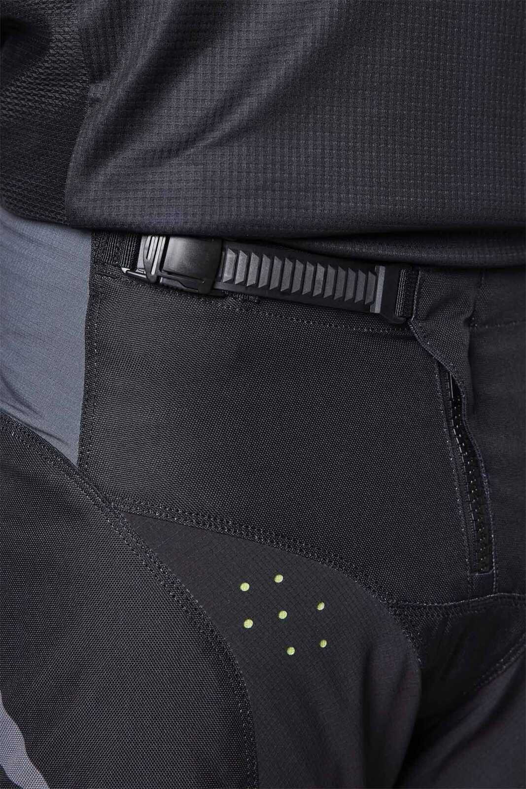 For durability, the pants use a robust 600D polyester construction on the main body. Heat and abrasion-resistant leather knee panels on both legs offer further reinforcement in the most critical wear areas, specifically against rubbing forces like knee braces, guards, and the bike itself.