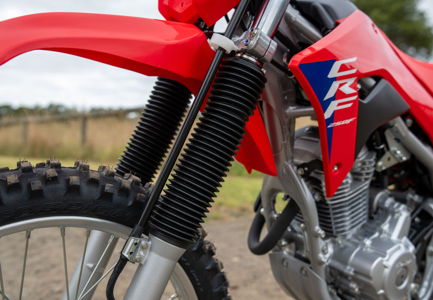 The telescopic Showa® fork features large 41mm sliders. That makes it strong and helps add to the CRF250F’s excellent handling.