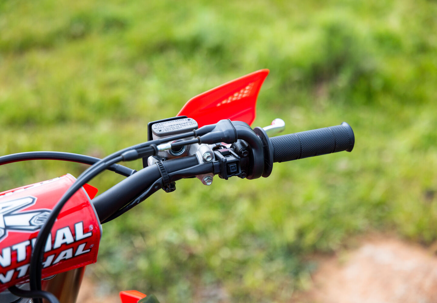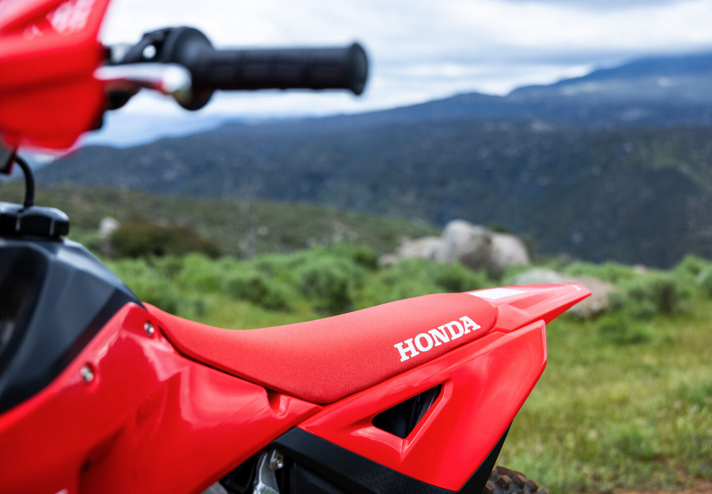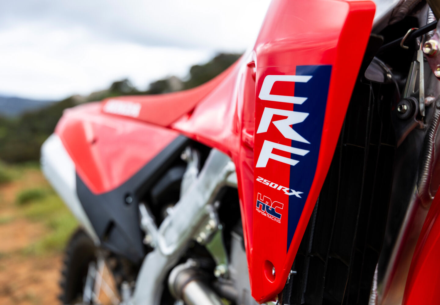 The CRF250RX frame is the foundation for the bike’s exceptional handling. Almost identical to a motocross one, just with a lower engine mount. The short swingarm delivers better rear-wheel traction, and reduces unsprung mass, important considering how much power you have on tap.