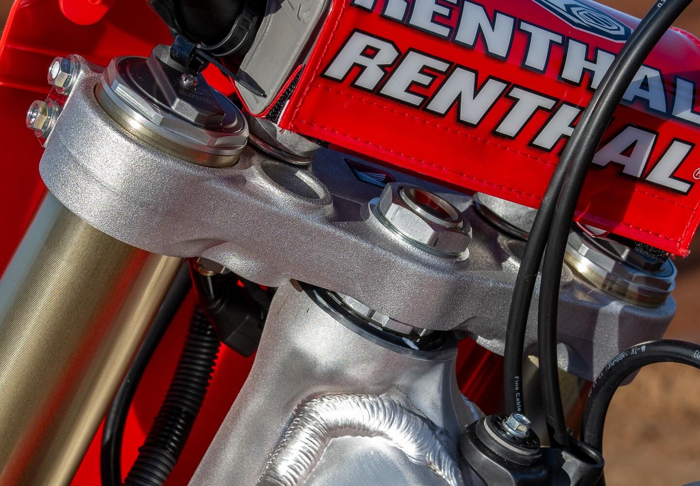 Triple Clamps: New top and bottom triple clamps work with the new frame, revised fork, new front axle and new steering stem for a more consistent suspension feel throughout the stroke.