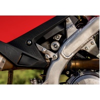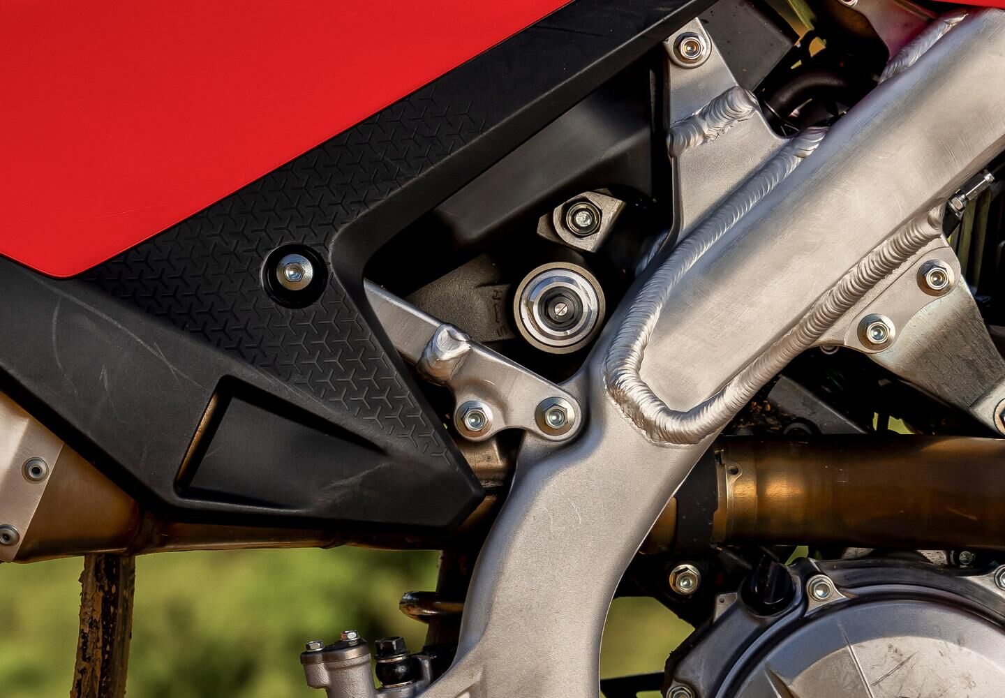 The new mounting point optimises lateral rigidity and reduces energy transmission from the rear of the bike to the front. Rear-shock removal time has been reduced by eliminating the need to detach the subframe to access the shock.
