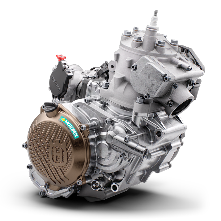 Crankcase: High-pressure die cast production processes allow for the crankcases to be manufactured with a thinner wall thickness to keep the overall weight to a minimum, and to position the shaft arrangements in the perfect position for optimised mass centralisation. This clever design aids the overall balance and agility of the TX 300 while the symmetrical engine mounts offer a calculated level of flex.