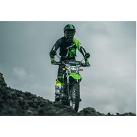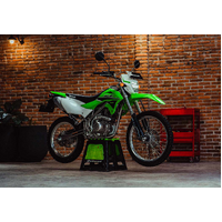Aggressive Bodywork Inspired by Kawasaki Motocross Racers: Racy styling inspired by KX motocross machines gives the bike aggressive, sporty looks that reflect its off-road potential. Sharper and more stylish with enhanced equipment, the KLX150 looks like a full-fledged enduro bike.