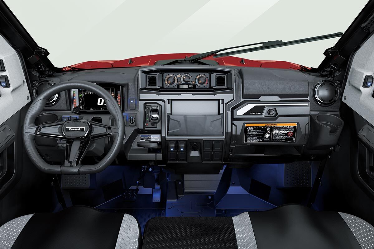 Game-changing performance: With its Kawasaki-built litre-class In-Line Four engine mounted in a sturdy chassis, the RIDGE CREW is well-equipped to take on a wide range of conditions, be they on the jobsite or on the trail. Power Modes and on-the-fly selectable drivetrain adjustability enhance the control offered by the high-power, high-torque engine and CVT.