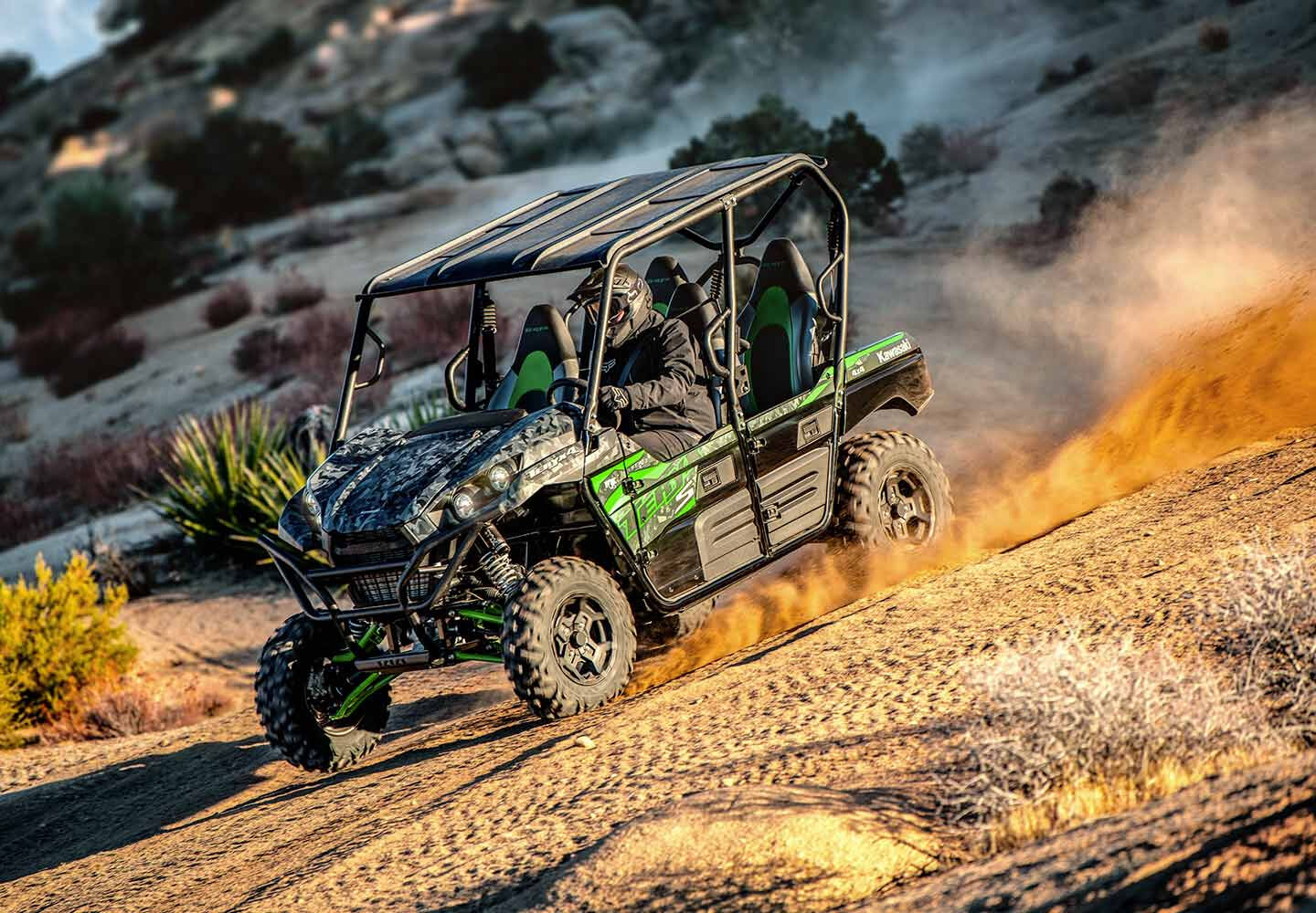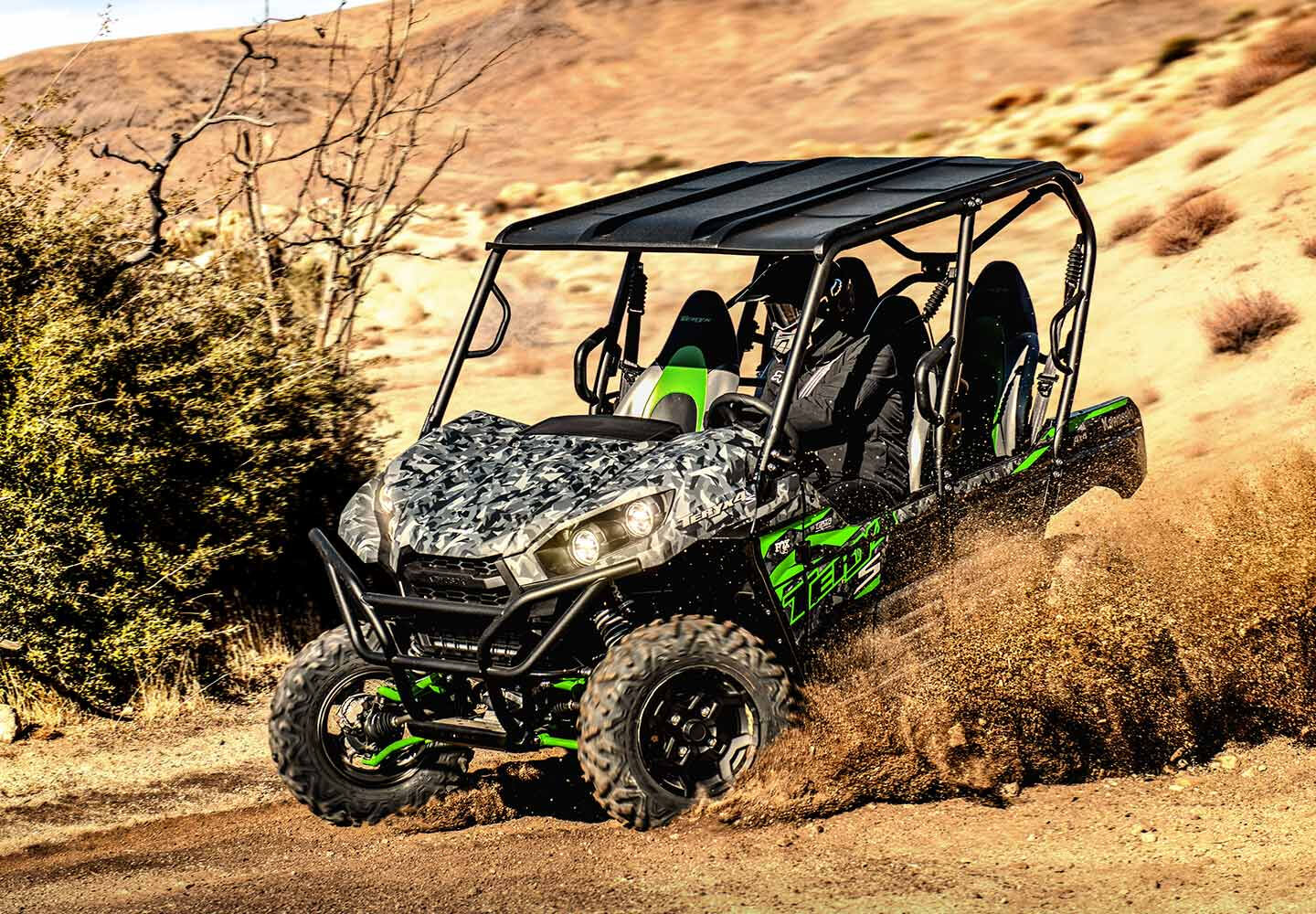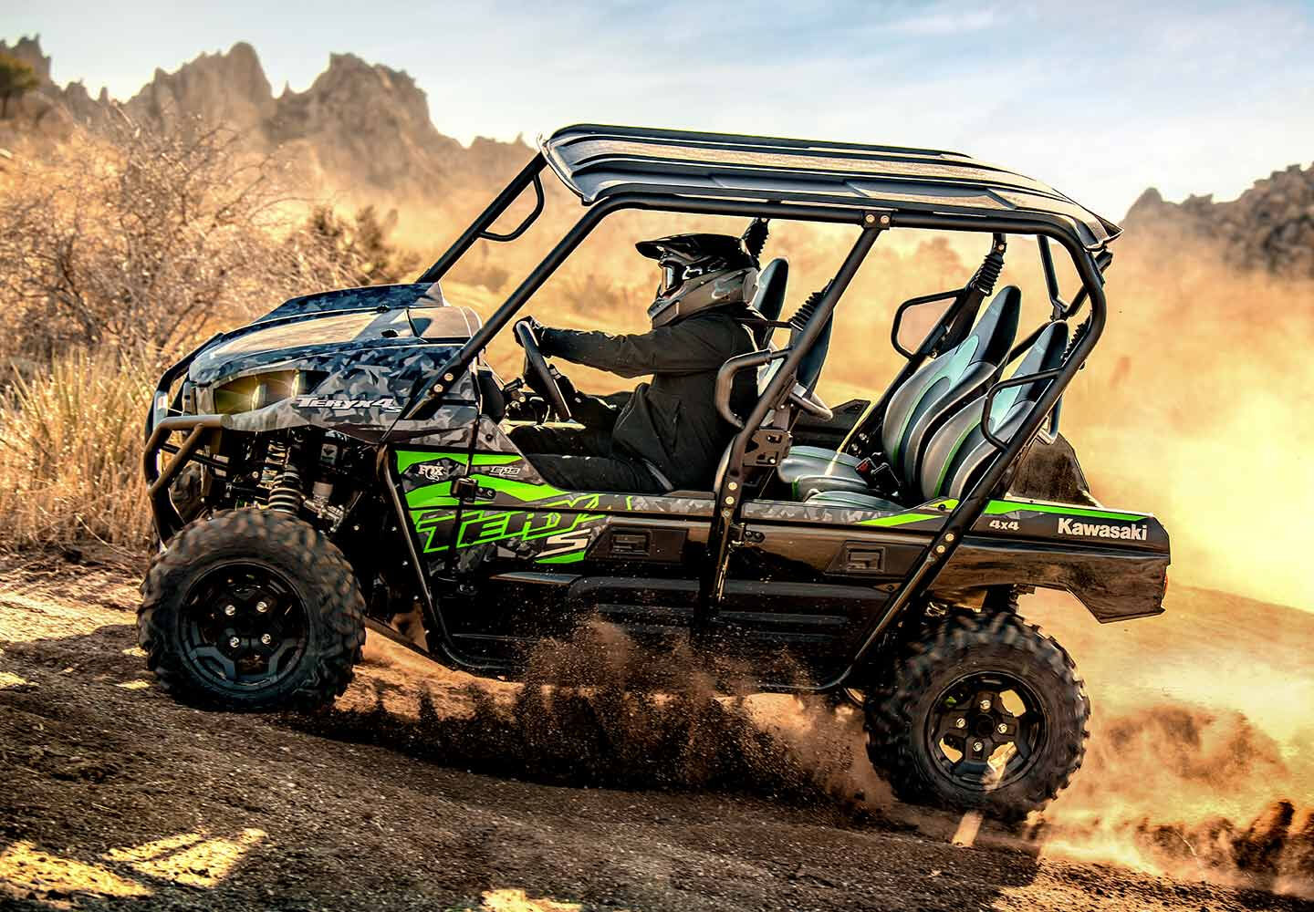 Eager for action, the four-passenger Teryx4 side x side is built to tackle tough trails. With the perfect combination of rugged sport performance and capability, the Teryx4 is made to conquer the outdoors with the entire crew on board. Take adventure to the next level with extra features only found on the Teryx4 S models.