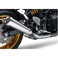 - EXHAUST - Carefully Considered Exhaust System Design: The exhaust system was designed to emphasise the presence of the In-Line Four engine. The dual-wall header pipes not only give the exhaust system a more robust appearance but also help resist discolouration over time. A lack of connector pipes or exhaust devices ensures clean, uninterrupted lines. Compared to the previous model, the new megaphone-style silencer offers greater visual impact, further reinforcing the Z900RS’ retro sport image. The header pipes, pre-chamber, and silencer are all made from high-quality stainless steel and feature a buffed finish.