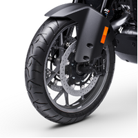 Wheels & Tires: The KTM 1390 SUPER ADVENTURE S is fitted with new DUNLOP MERIDIAN tires. These tires feature an innovative 'ice-ax' tread pattern, which increases traction on unpaved roads and provides optimum water drainage. They also offer superb handling and stability on the tarmac, making them perfect for touring or tearing up mountain passes. Dimensions: 120/70 R 19 in the front and 170/60 R 17 on the rear.