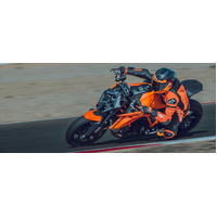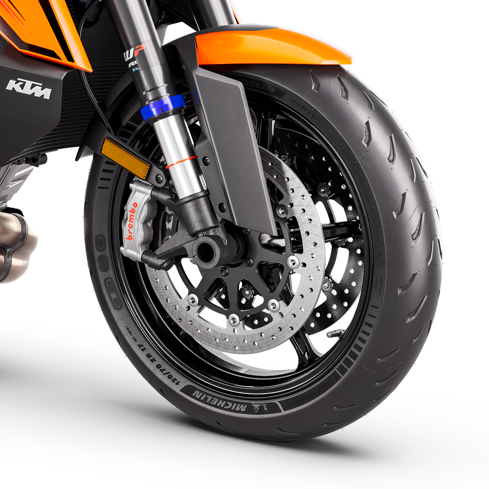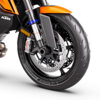 Wheels and Tires: The KTM 1390 SUPER DUKE R EVO comes fitted as standard with lightweight, MICHELIN Power GP rubber. Thanks to the dual compound technology, these tires provide enhanced grip both on straight-line acceleration and more importantly, at lean-angle. Not only do they promise exceptions to track performance, but they offer outstanding road manners too in both wet and dry conditions.