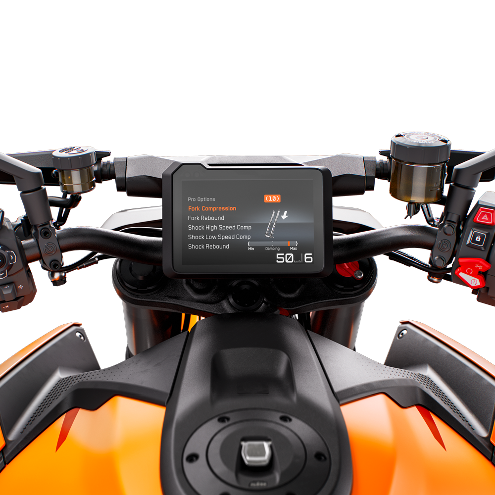 Suspension Pro: The optional SUSPENSION PRO package allows for even more adjustment when it comes to the suspension. It adds two additional suspension damping modes, namely TRACK and PRO, with three auto-leveling preload settings, as well as the ability to turn Anti-Dive mode on or off. This also adds a Factory Start option, inspired by the launch device from the KTM RC16 factory machine. Here, the rear shock preload is automatically reduced to lower the rear when coming to a standstill. This allows for increased straight line stability and loads weight on the rear wheel to better launched off the line.