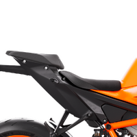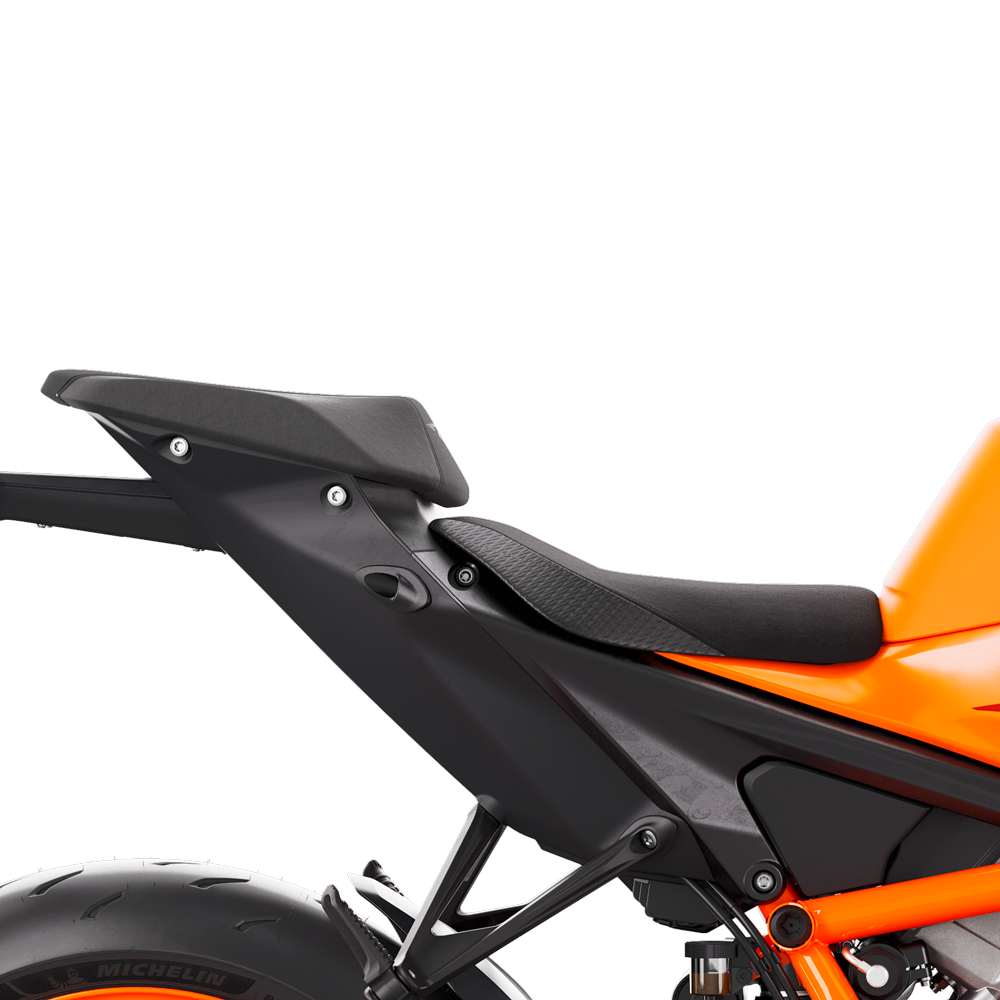 Seat: Performance-focused, but still comfortable for all-day riding, the KTM 1390 SUPER DUKE R EVO is designed to be track-capable one second, and a real-world passenger motorcycle the next. For that reason, the seat is made to be ultimately usable in all scenarios. At 834 mm, it's the perfect height for aggressive track work, but low enough to provide easy access and comfort. The pillion seat wasn't forgotten here either, making it equally as comfortable for longer rides.