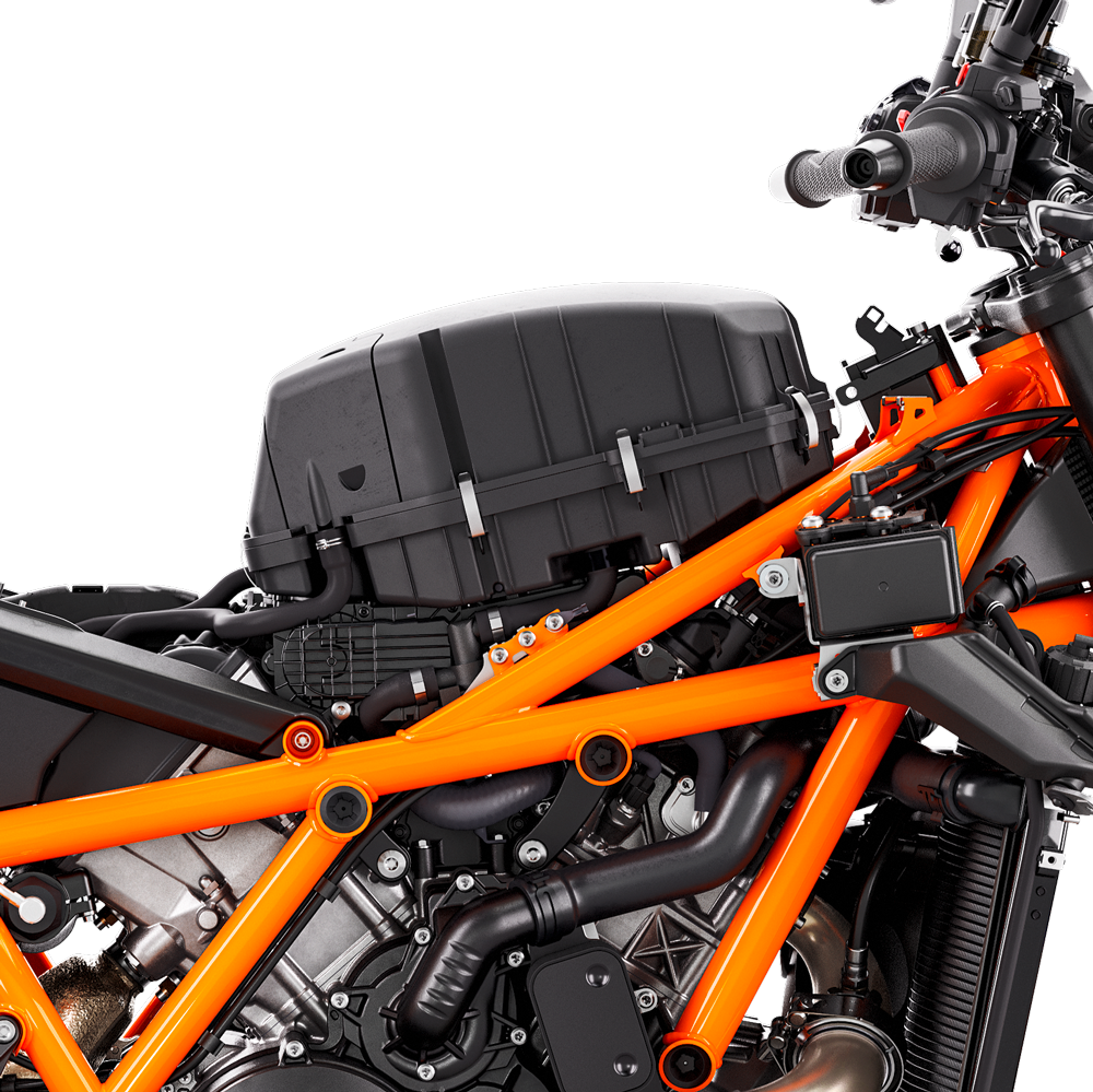 Air Intake: The ram air system allows for more direct air flow meaning the KTM 1390 SUPER DUKE R EVO breathes like THE BEAST it is. With approximately 10 liters of airbox capacity, it consumes oxygen like a cheetah at full pace, while the design ensures easy maintenance when the need arises.